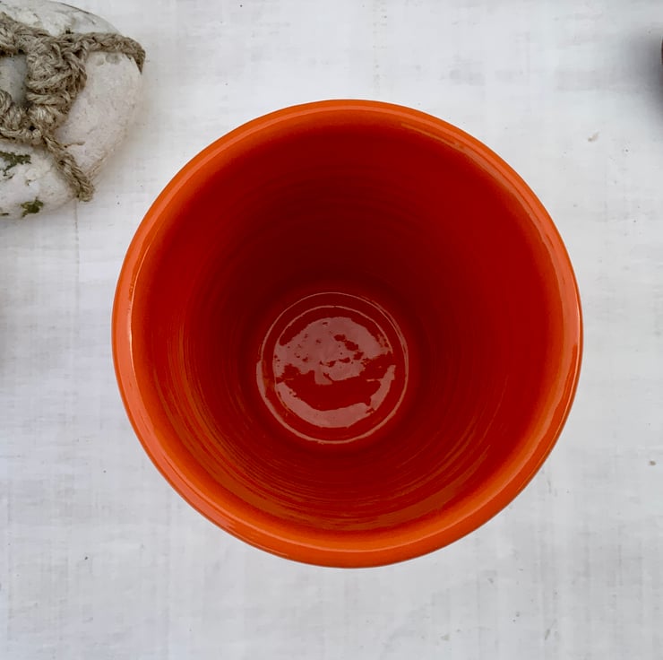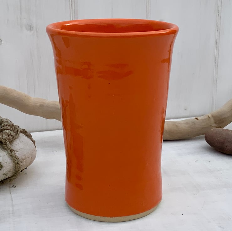 This stoneware handleless mug (beaker) is lovingly wheel-thrown for a comfortable, balanced feel in your hands. Finished in a bright Orange Gloss glaze, this will certainly standout in the crowd . Each piece is unique, making every mug one of a kind. Perfect for your morning coffee, afternoon tea, or a warming hot chocolate, this handcrafted handleless mug brings a little artistry to everyday rituals.