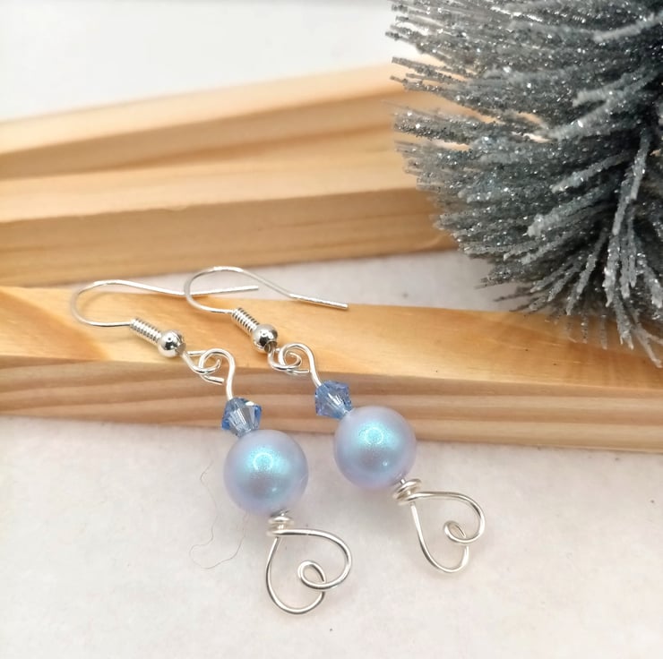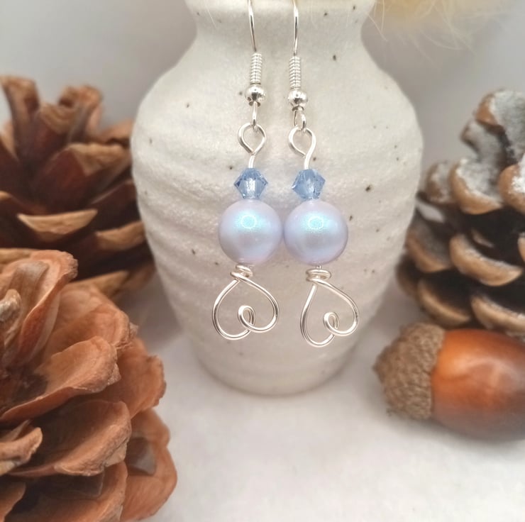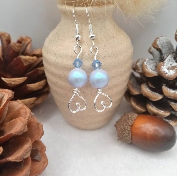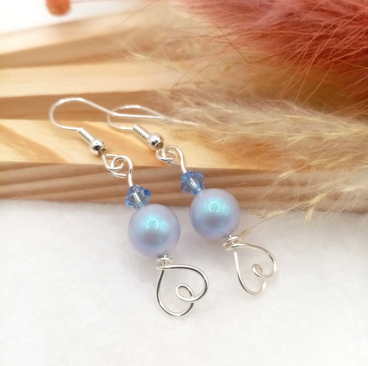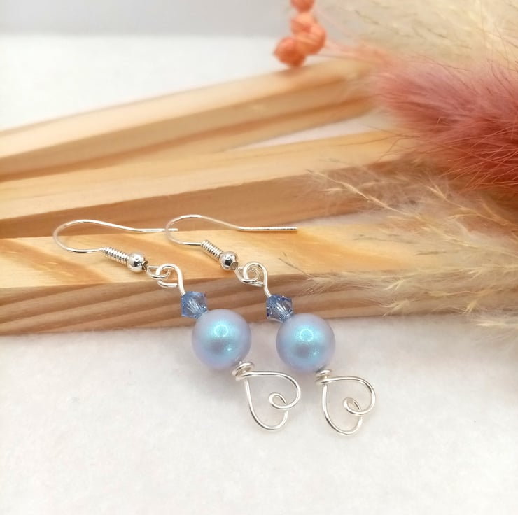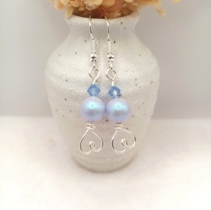 Serinity crystal pearl earrings in iridescent dreamy blue with silver plated nickel-free earring hooks and a cute love heart design on the base.