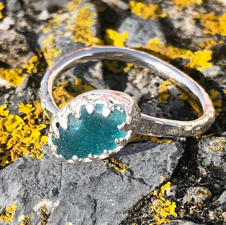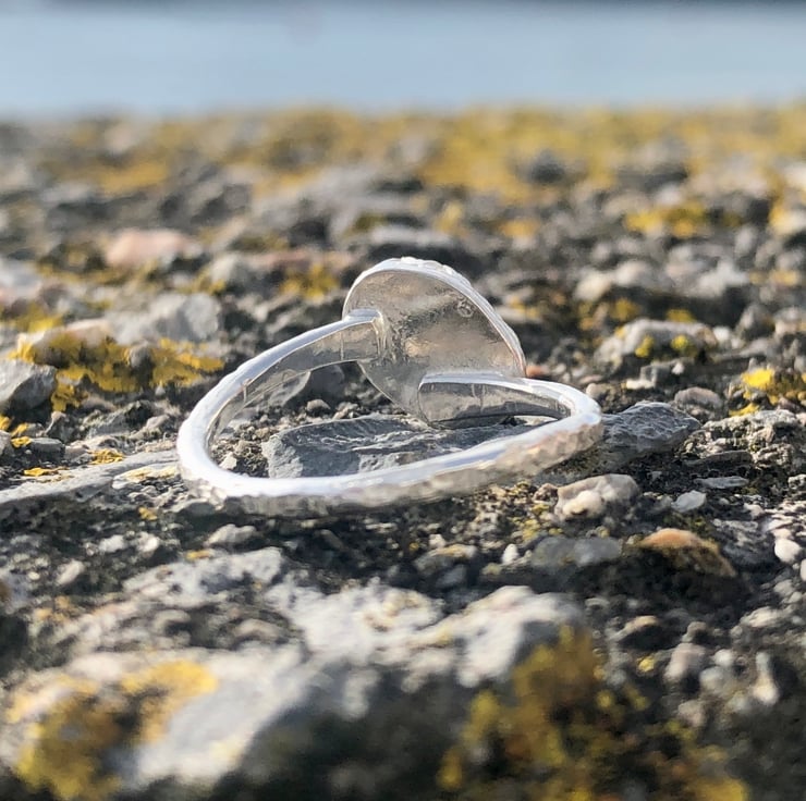 This has been set in a decorative fine silver bezel (.999) with a sterling silver (.925) 1.5mm wire ring band, which has been hammered to give the extra sparkle. This is a beautiful ring that really stands out from the crowd.