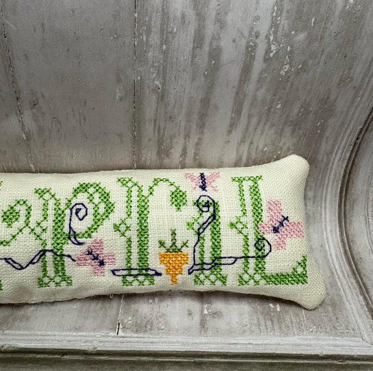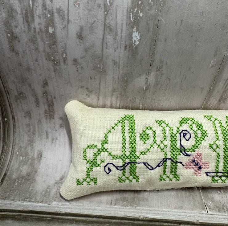 Bowl Filler machine embroidered cross stitch design. Measuring 6" x 2". Perfectly Pale prewashed linen fabric filled with polyester fibrefill. Little pillows of fun. Select 1 or fill a bowl full of Spring colours.