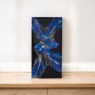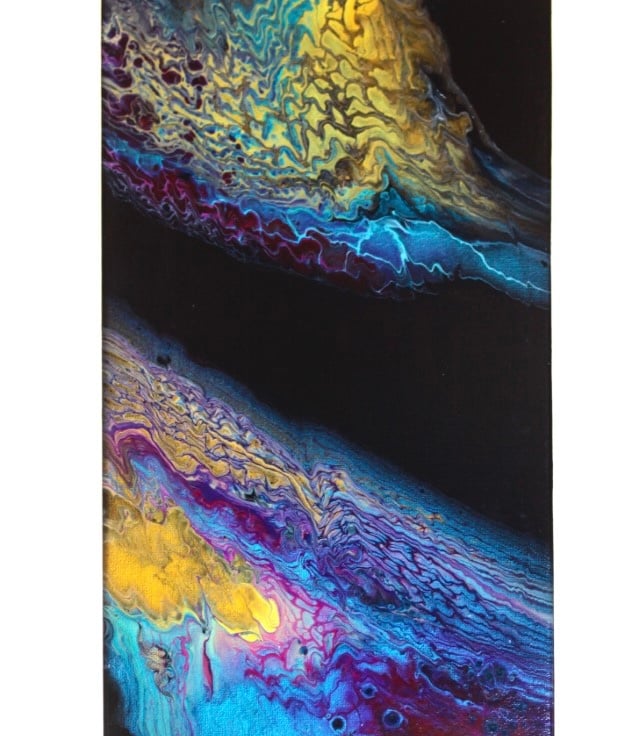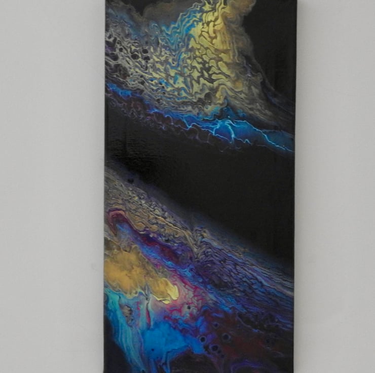 A fluid art acrylic painting , blues , gold and purples make this a striking piece.