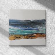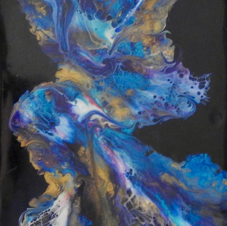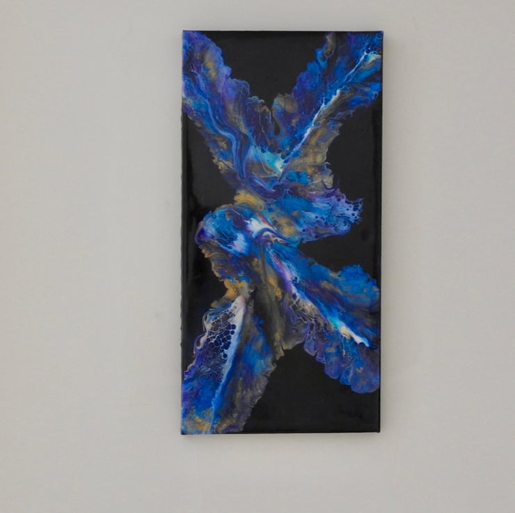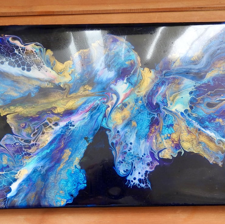 This painting has such amazing patterns and shimmer comes with a top coat of eco resin which gives that glass look and ready to hang . And is an original piece and cannot be repeated .