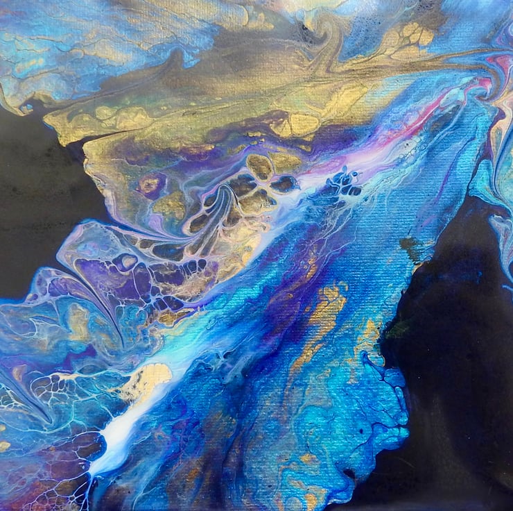 A fluid art acrylic painting , blues and golds inspired by the rivers flow .