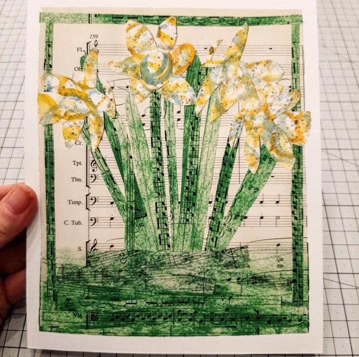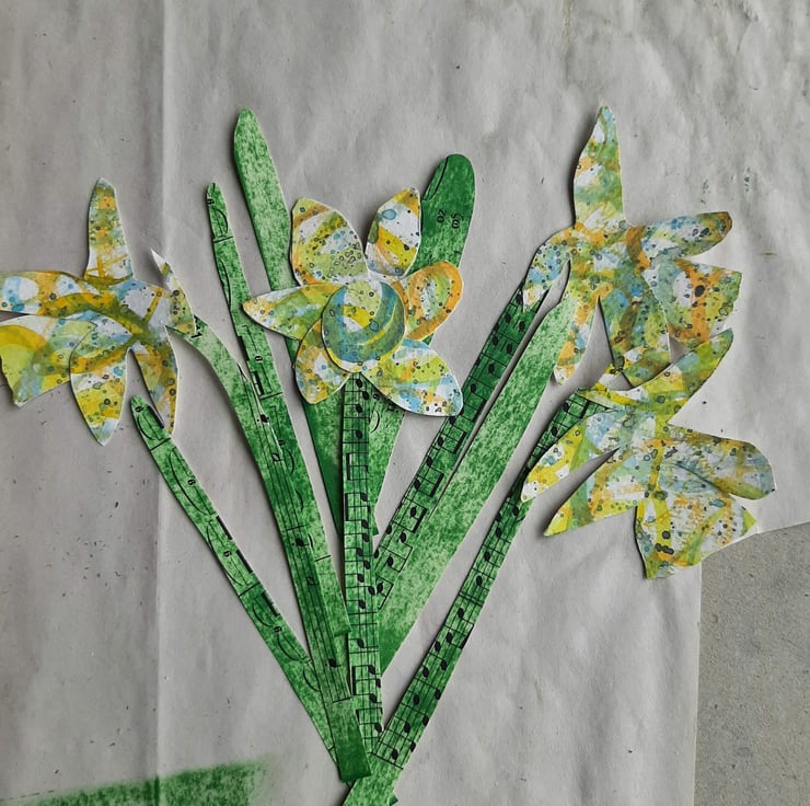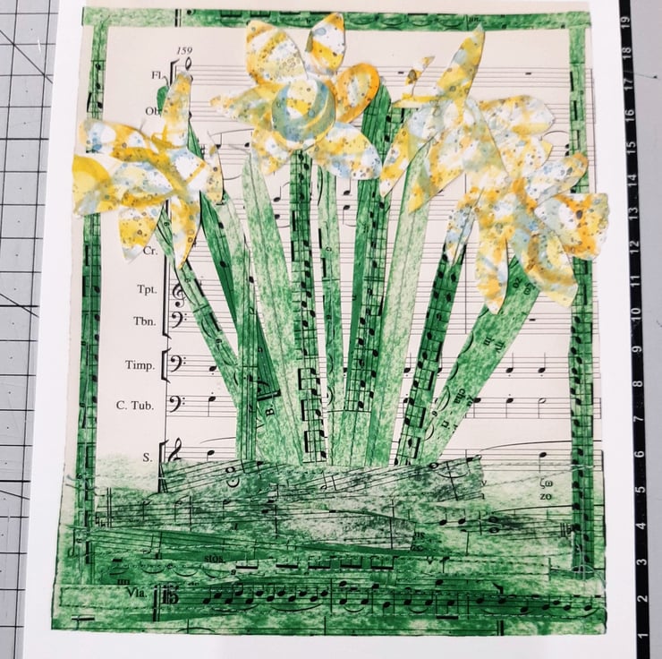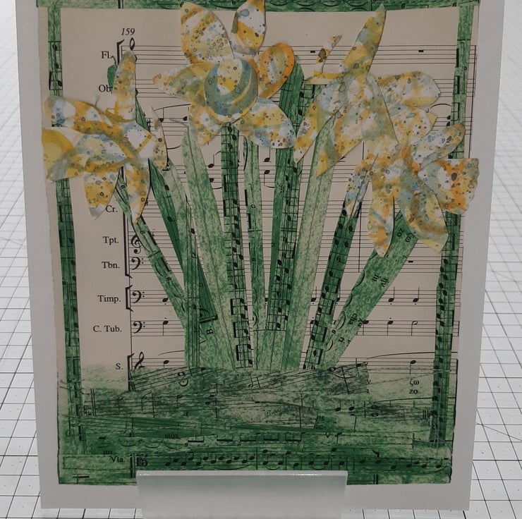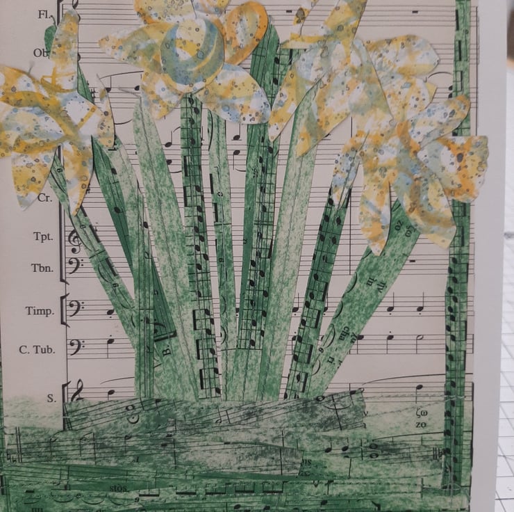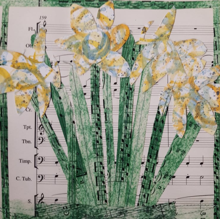 The original collage depicts of bunch of daffodils created as a paper collage using music papers coloured with green ink, and the daffodil flowers cut from pre-painted papers in yellows.