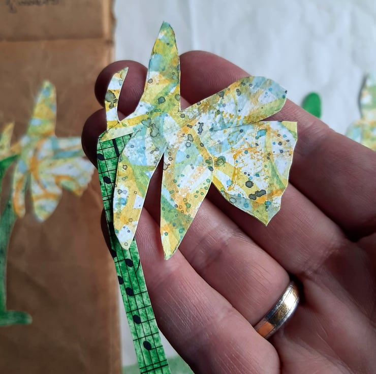 The painted papers for the daffodil flowers originated for an Instagram challenge, called coloricombo, where an artist chooses a piece of artwork and picks out about 3 colours and we each make our own image using those colours. I don't often use yellow in my work but this combination of yellow and green instantly made me think of daffodils.