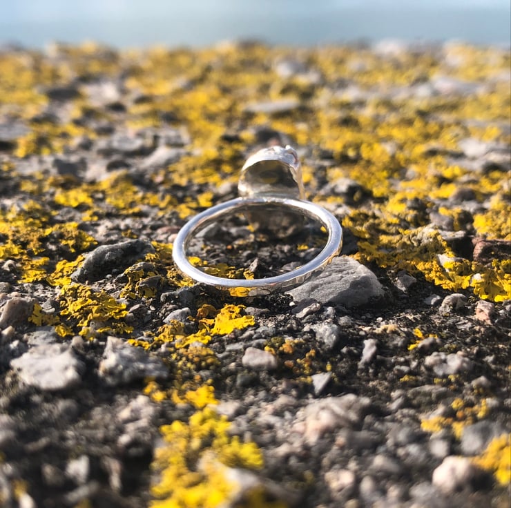 This has been set in a decorative fine silver bezel (.999) with a sterling silver (.925) 1.8mm wire ring band which has been hammered for extra sparkle!