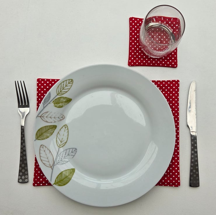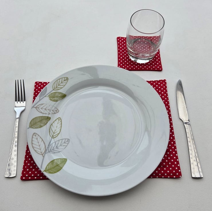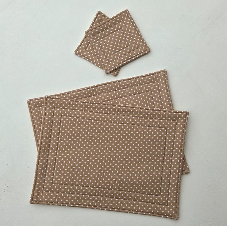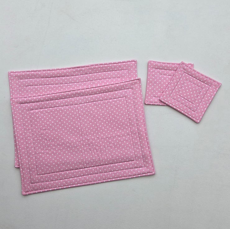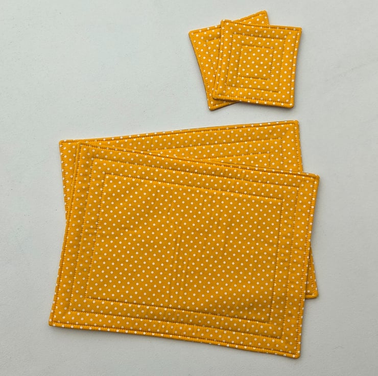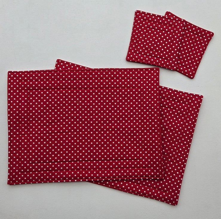 Each place mat and coaster is made from coloured polka dot cotton fabric on the front. On the reverse there is plain cotton corresponding fabric. Sandwiched between the two fabric layers is lined with dense fleece material. all layers have been quilted through in three decreasing boxes to give a popping effect.