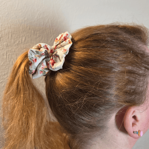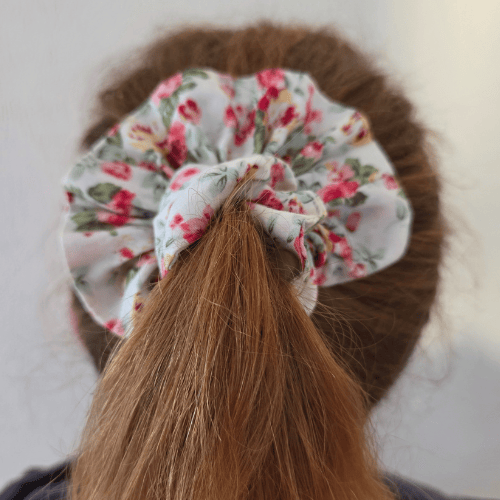 Elastic inside the fabric brings the scrunchie to a medium size fitting comfortably in your hair or even around your wrist.