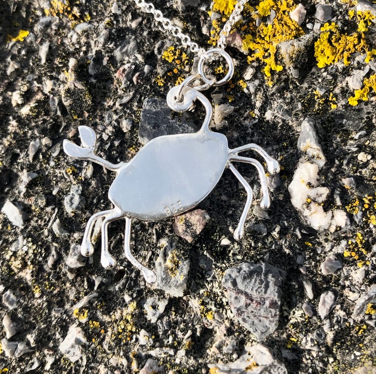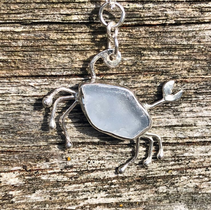 This beautiful piece of cornflower blue seaglass was found along the UK's South West coastline and has been set in a fine silver bezel (.999) and using recycled (ecosilver) sterling silver wire (.925) to create a beautifully unique crab pendant. This piece has not been hallmarked.