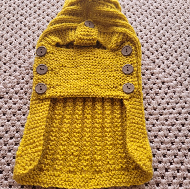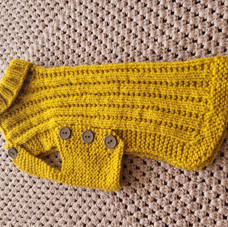 Hand knitted dog coat in mustard yarn. This colour really stands out in sunlight. The brown buttons are a contrast to it. Size XS. Length 11 inches. Chest 14 inches. Suitable for male or female dogs.