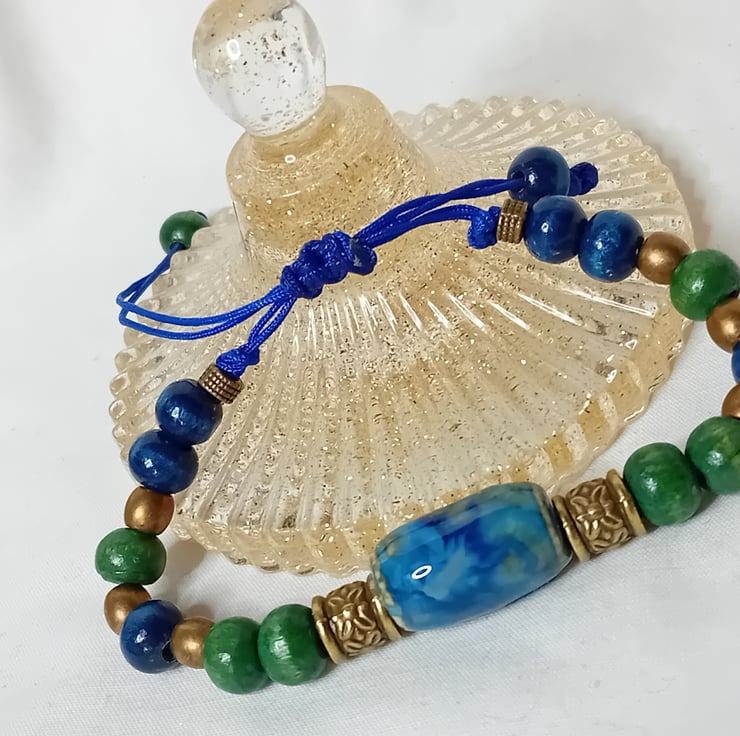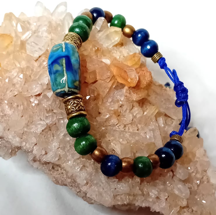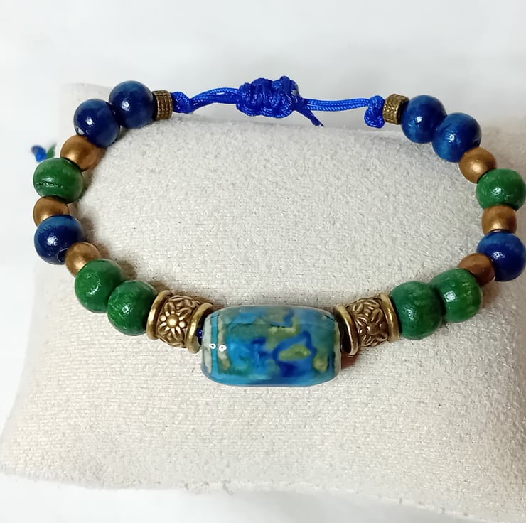 This bohemian styled bracelet consists of blue & green wooden beads measuring 8 x 6mm. The focal point is a high fired ceramic bead measuring 20 x 12mm . Accented with bronze spacers in various sizes and designs. The clasp is a slide clasp and fits 6 - 8 inches comfortably. If a larger size is needed you can choose that in the drop down.