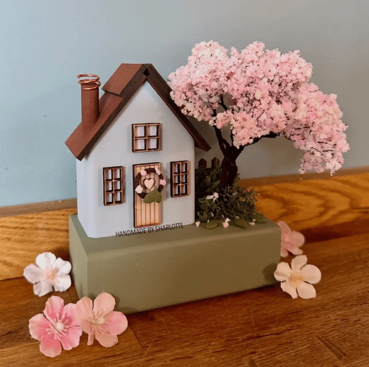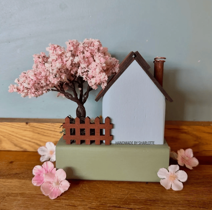 Hand cut, sanded, painted and assembled, on all elements designed by myself wooden Scandinavian cottage house ornament - Spring Cherry Blossom Edition.