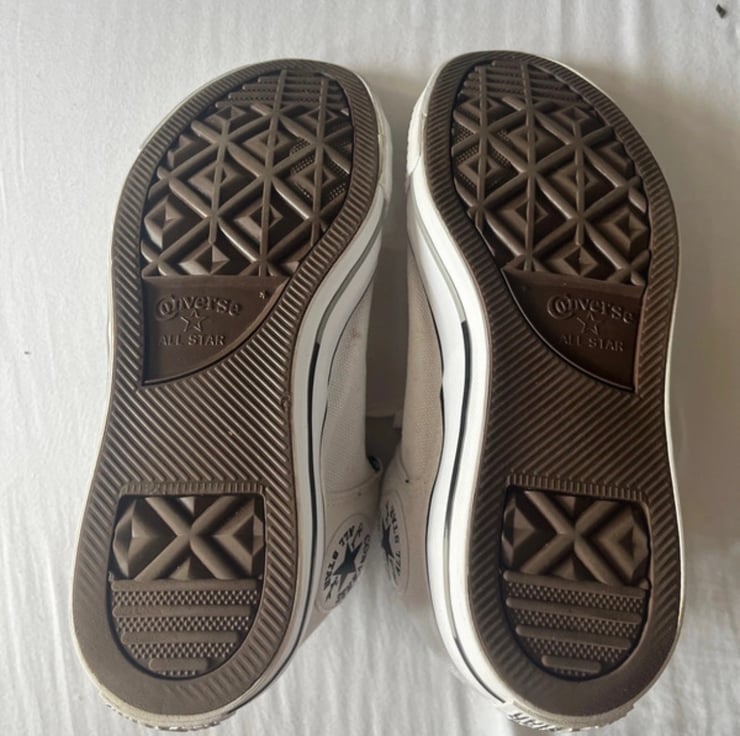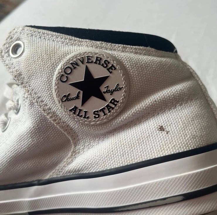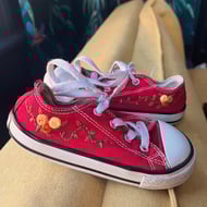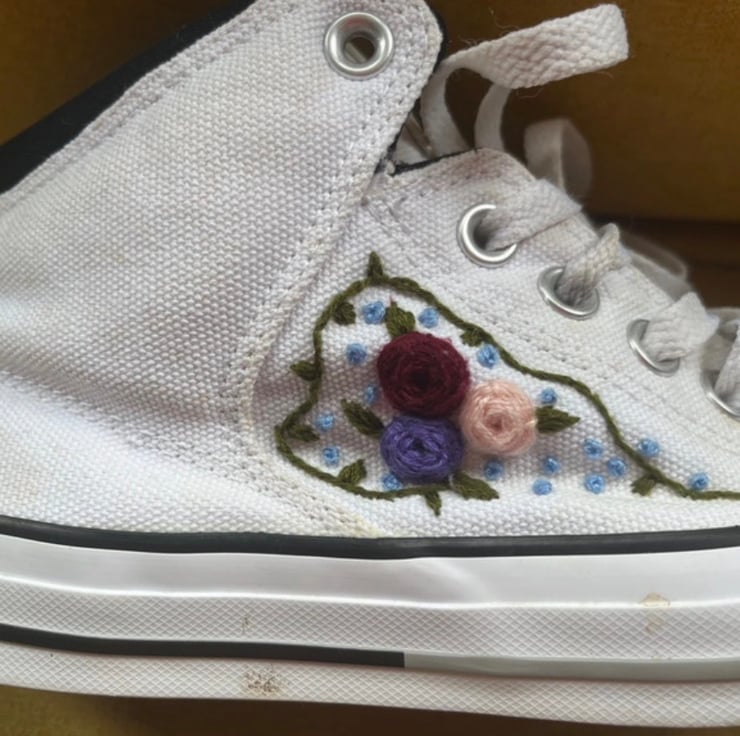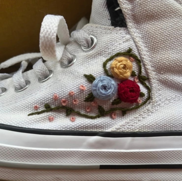 A truly unique pair of classic white Converse high tops, lovingly hand embroidered with delicate rose detailing by me.