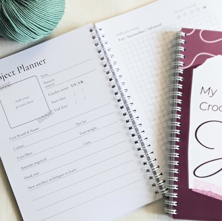This crochet planner has a white wirebound spine, so can be placed flat for easy use whilst you are busy crocheting. There are 88 pages (44 sheets), in high quality 120gsm weight white paper.
