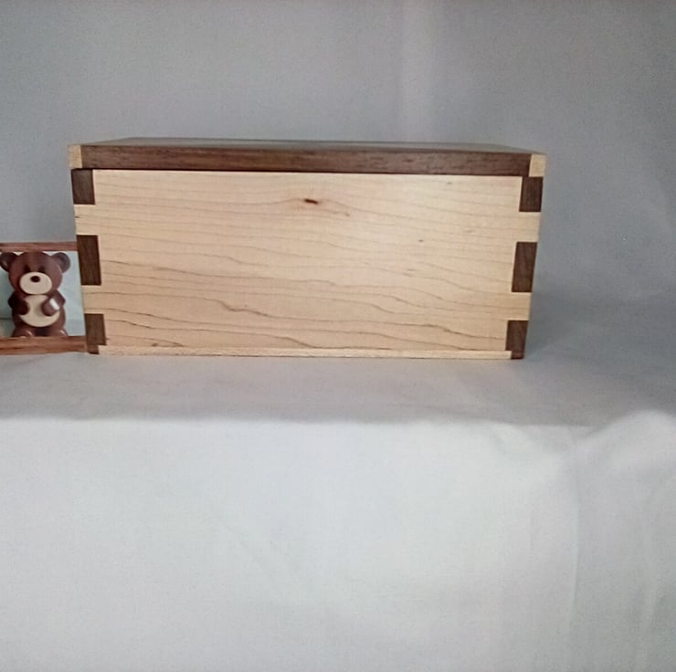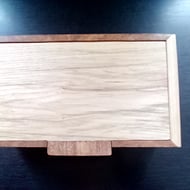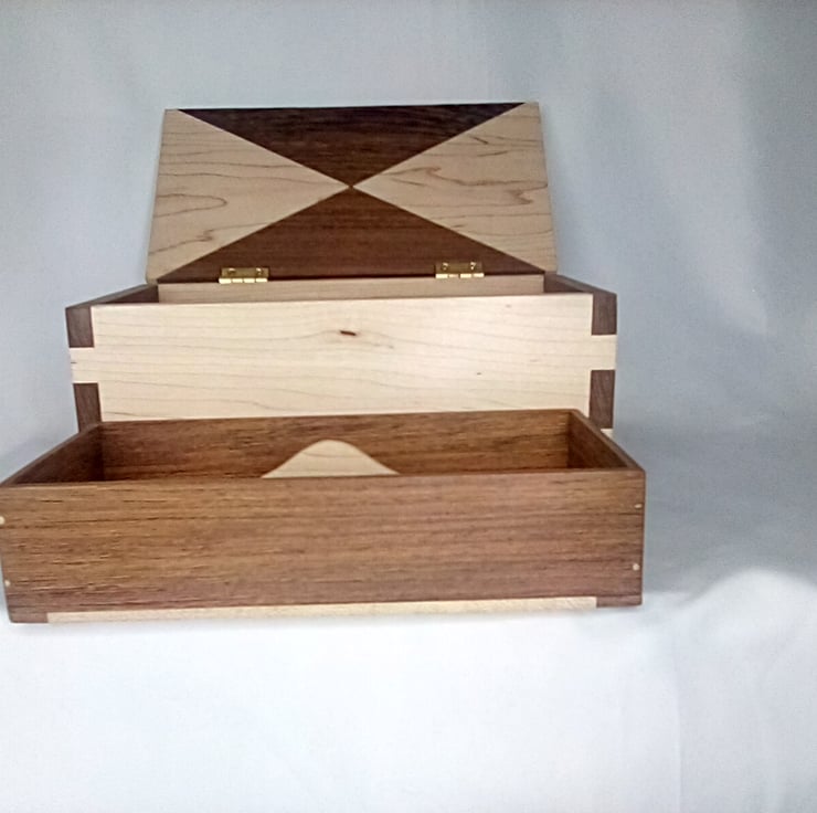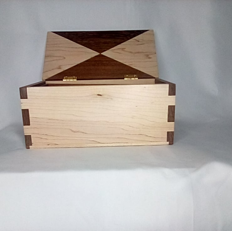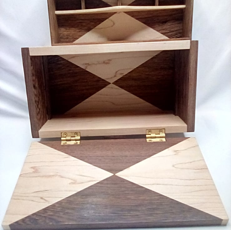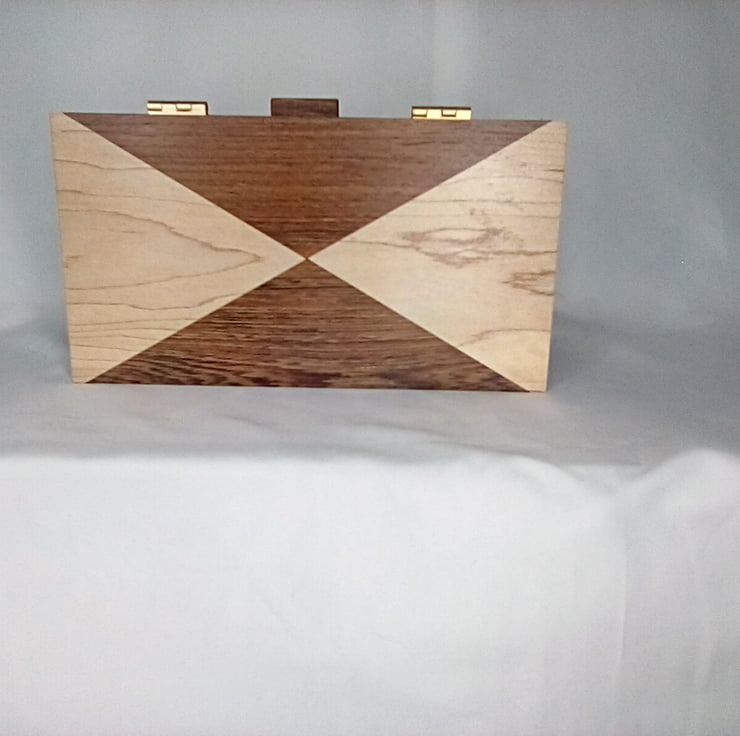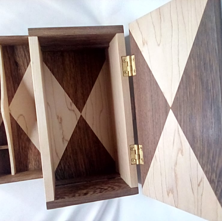 Jewellery box made from maple and panga cut in a diamond pattern throughout the box with its lift out divided tray for smaller items and plenty of space in the bottom for other jewellery having solid brass hinges and a perfect balance of colour standing 24cm wide 9cm high and 12cm deep finished in a natural wax to enhance the beauty of the wood