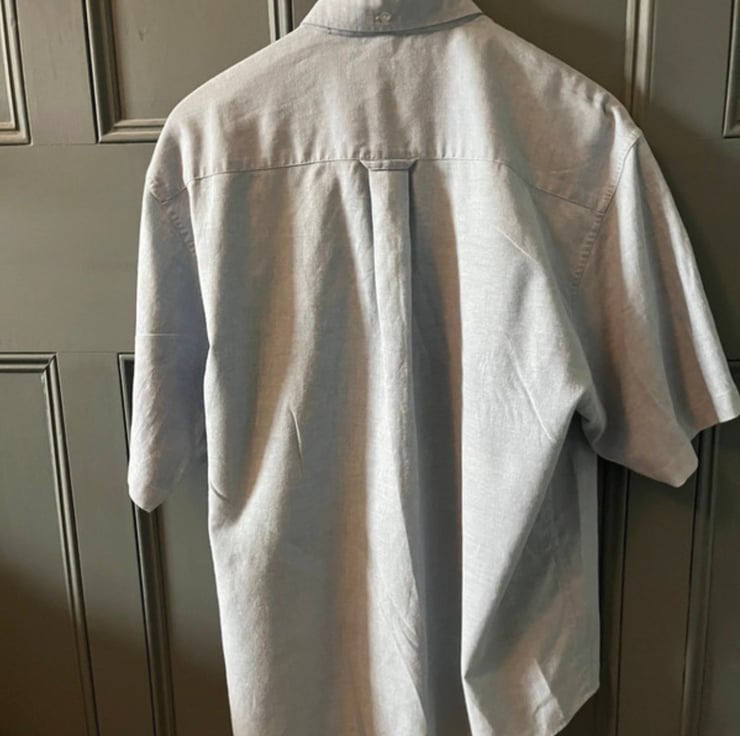 Bring a touch of handmade charm to your wardrobe with this blue Ben Sherman short-sleeved button-up shirt, lovingly transformed with original hand-sewn floral embroidery running down the button fastening. Every stitch is done by me, making this a one-of-a-kind piece with subtle, artisanal flair.