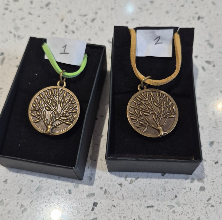 Bronze coloured base metal Alcohol ink pendant green and gold with coloured leather cord, tree of life on the reverse.