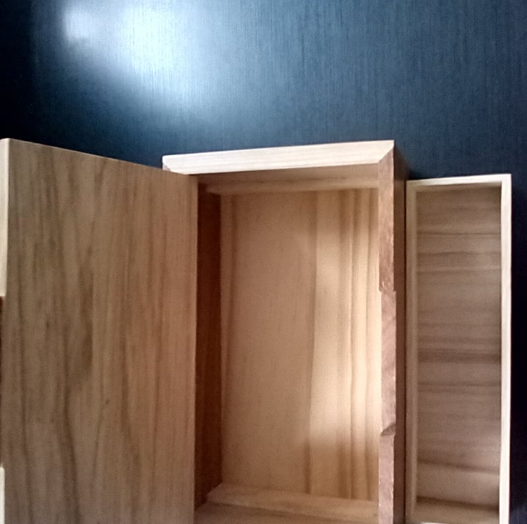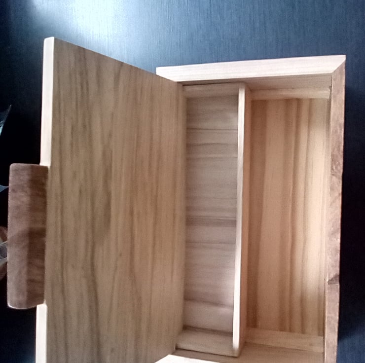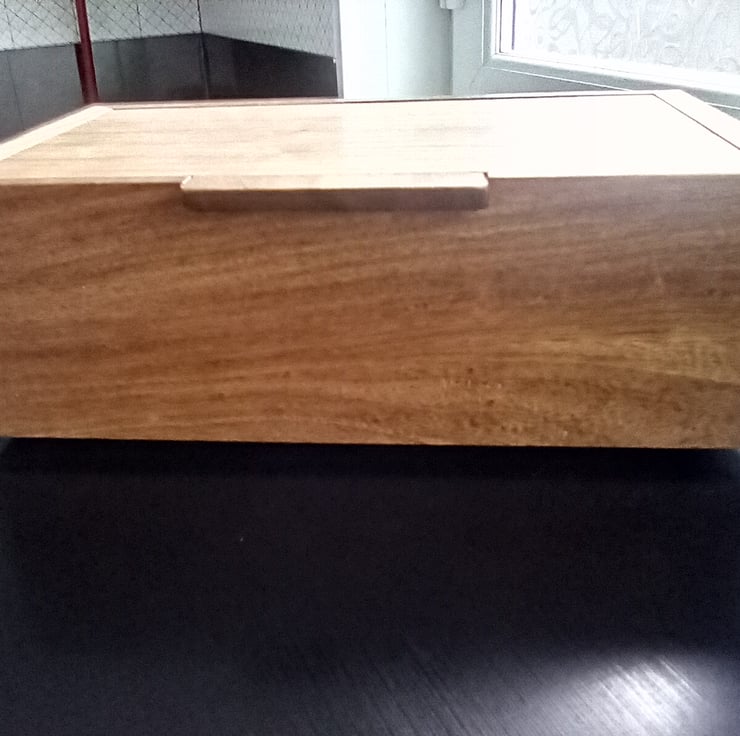 Hand made jewellery box made from merging with a sliding tray and brass hinges every piece of this box has been hand planed hand sanded and hand cut making it very unique with its full width sliding removable tray inside and its built in lift up tab standing 24cm wide 9cm high and 15cm deep finished in a natural wax to enhance the beauty