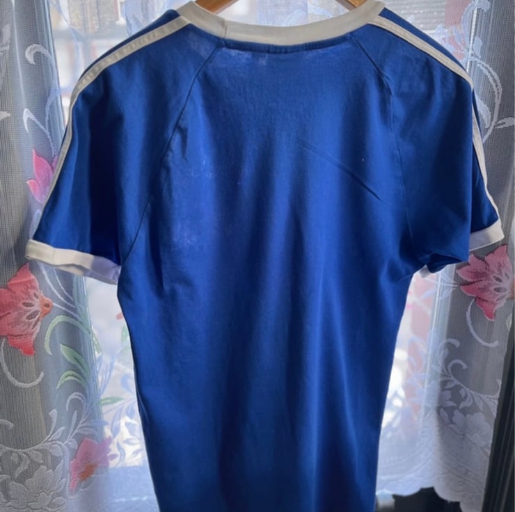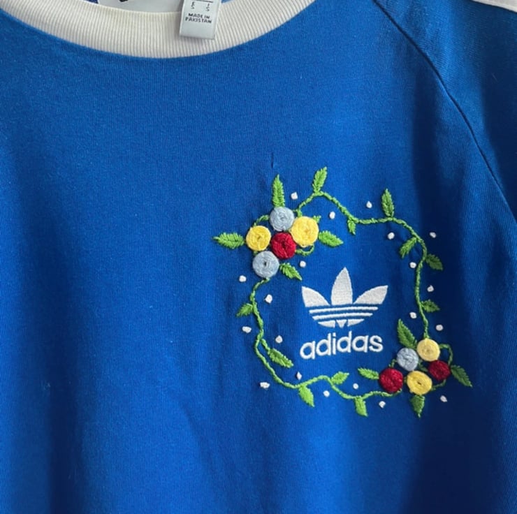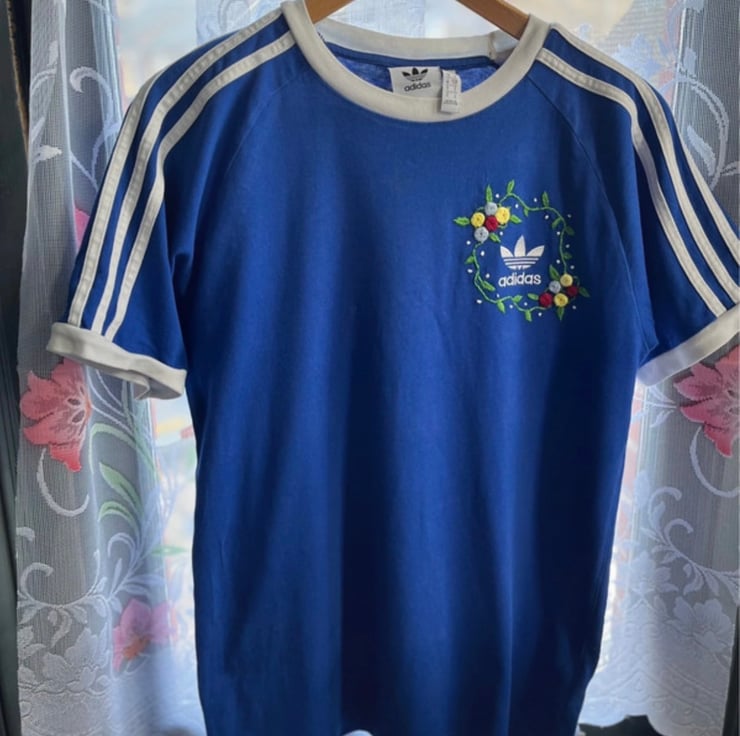 Add a touch of handmade charm to a classic sporty favorite! This bright blue adidas triple stripe t-shirt has been lovingly personalized with original hand-sewn floral embroidery around the logo, stitched by me to make it a one-of-a-kind piece. The perfect blend of sporty style and artisanal flair.