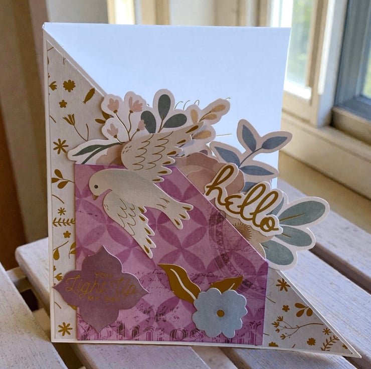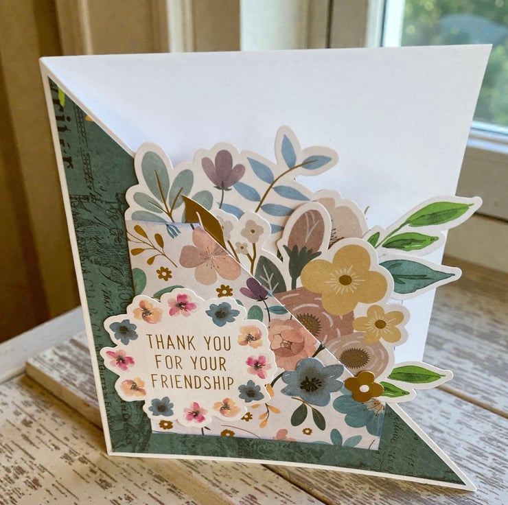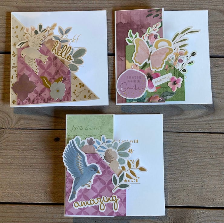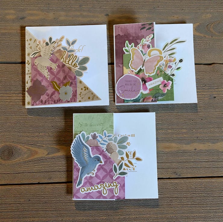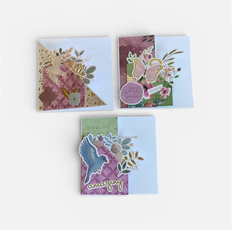 Set of three handmade 5 x 5 inch greeting cards featuring shaped fronts and layered floral embellishments for a dimensional, boutique-style finish. Each card is individually designed with coordinated papers, die cuts, and raised elements that give a beautiful textured look.