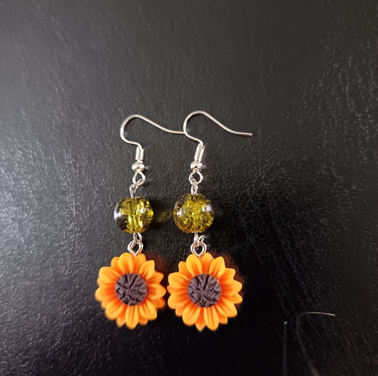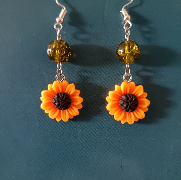 These handmade earrings are crafted with stainless steel hooks, hard resin sunflower charms and large green glass beads.