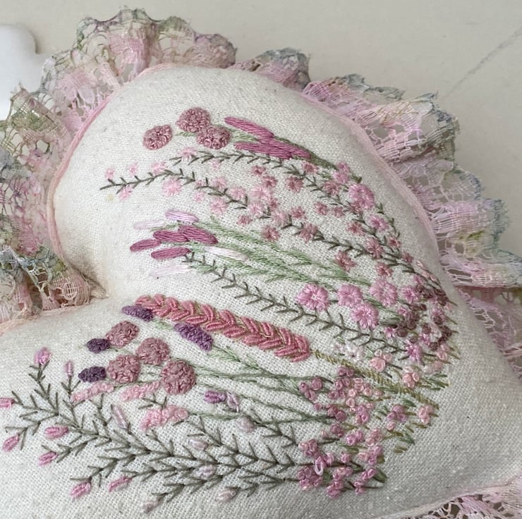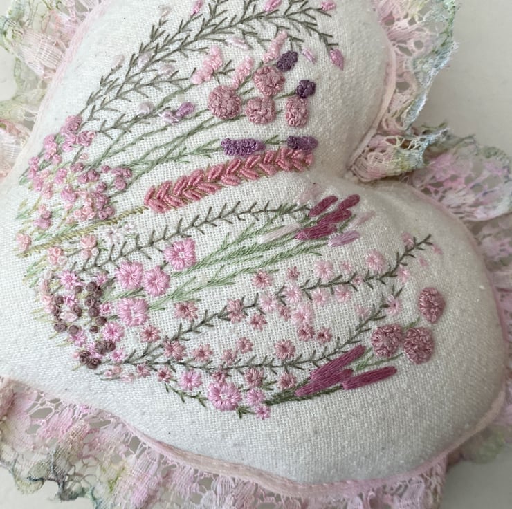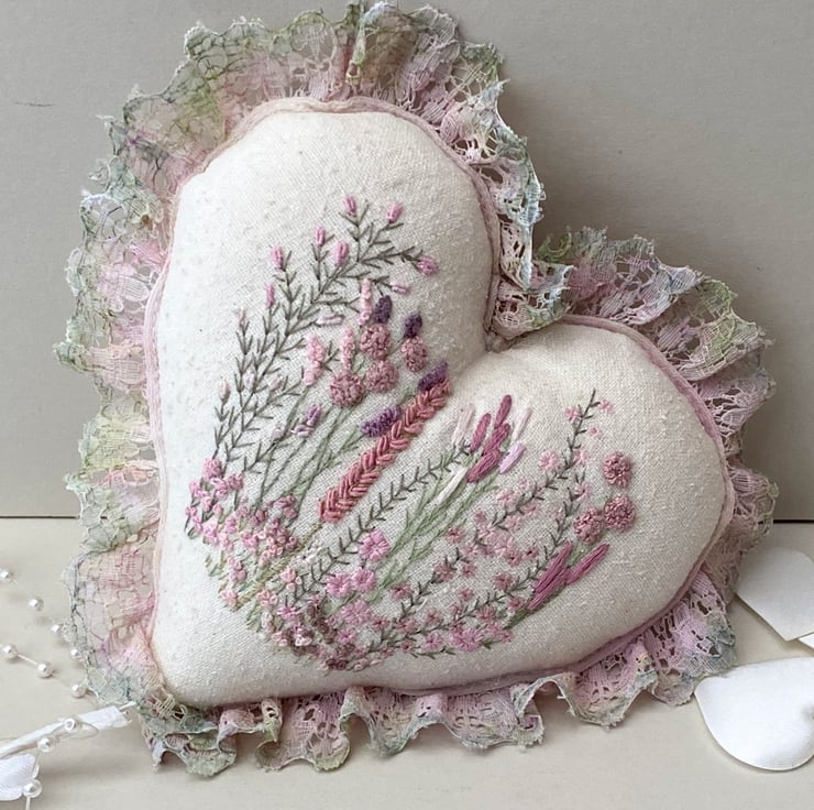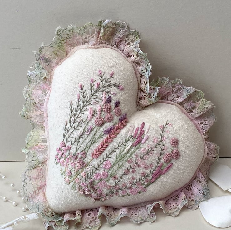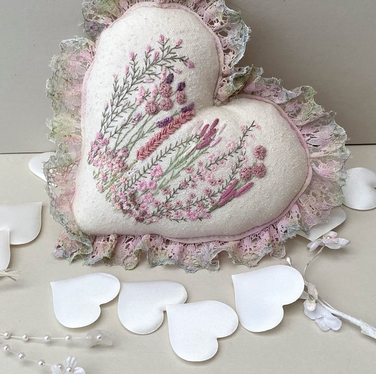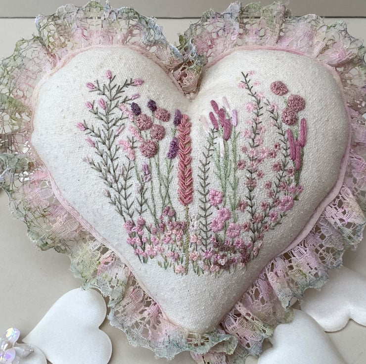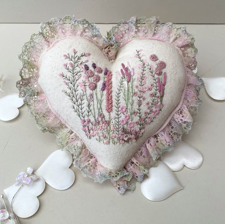 Finished with hand coloured lace, using watercolour pencils I blended various shades and tones of pink and greens onto white lace until I was happy with the colour then heat set with an iron. Sewn into place around the edge of the heart, It gives a lovely soft, romantic vibe.
