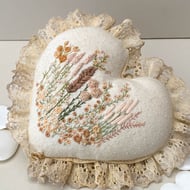 Beautiful hand embroidered ornamental heart which can be laid or hung on a wall. A highly detailed hand embellished stuffed heart measuring approx 5" width and length not including the lace.