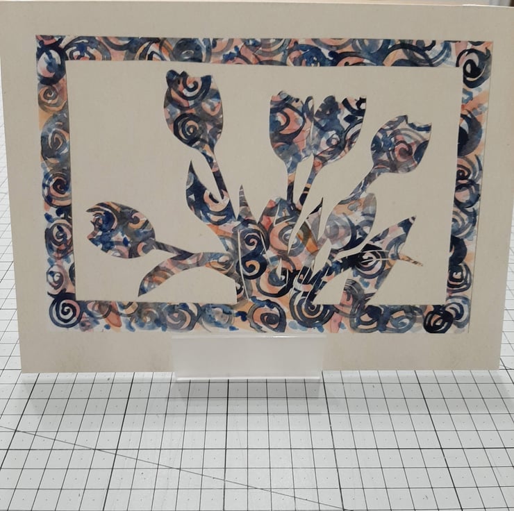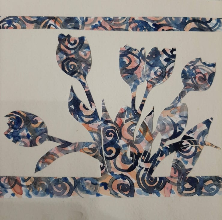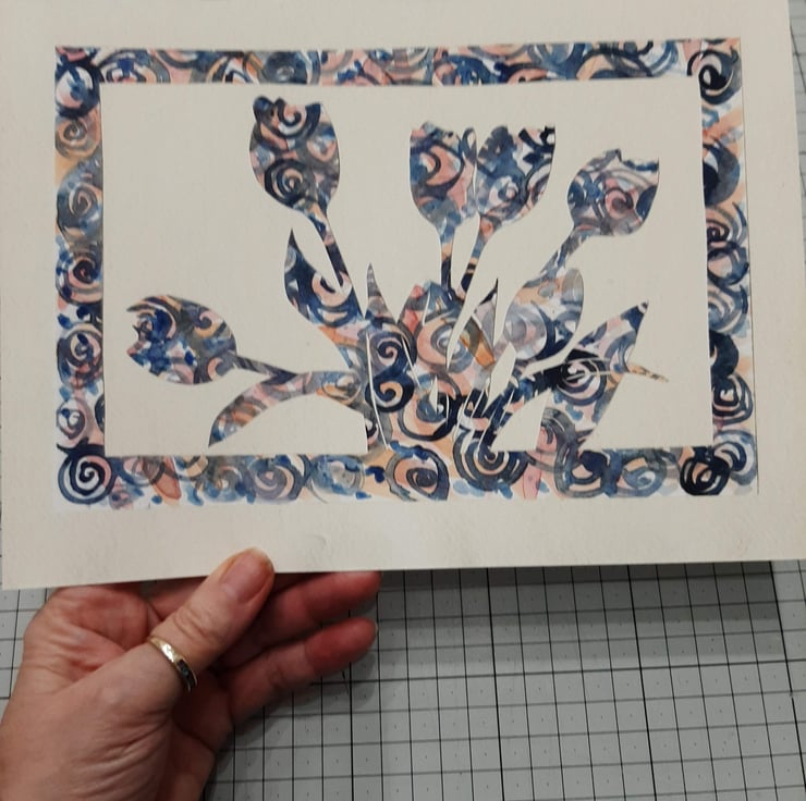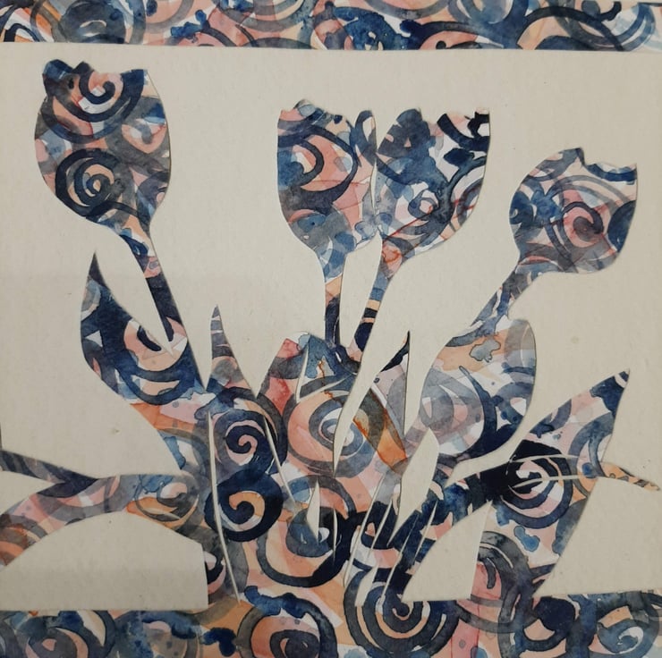 I love the idea of cutting an image from one piece of painted paper and the randomness this creates. I find tulips are such an iconic flower and very recognisable as an outline. I drew the outline of the tulips on the back of the paper and carefully cut out with a scalpel to leave a border and the flowers themselves. Taking away everything that is unnecessary.