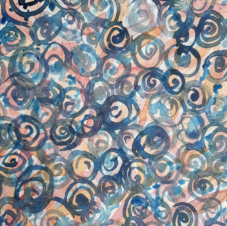 The original collage depicts a bunch of tulips and a border, all cut from one piece of painted paper. The painted swirls of the original painting is quite different colours from the usual green leaves and purple or pink or red flowers, but I enjoy the surprise of this. The background is khadi paper which is a thick textured paper made from cotton rags. The highlights of the textures are picked up in the print.