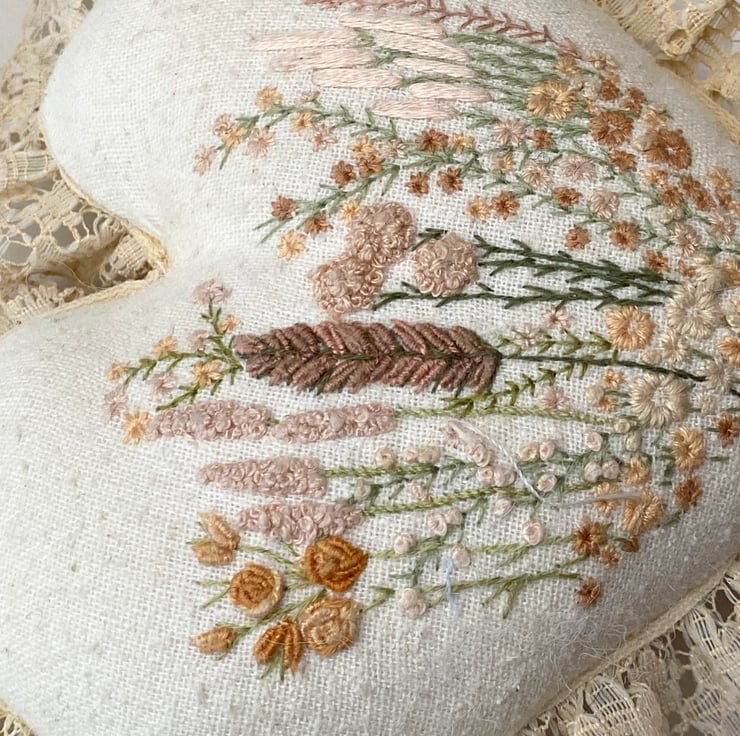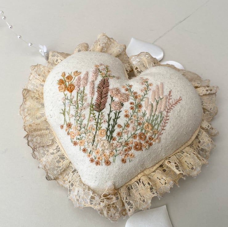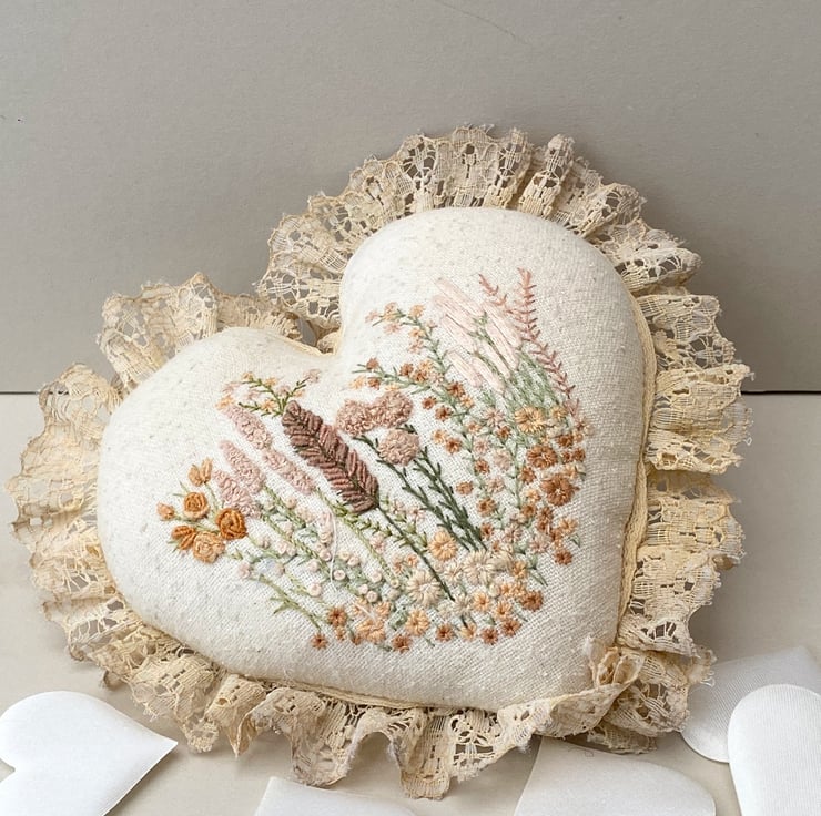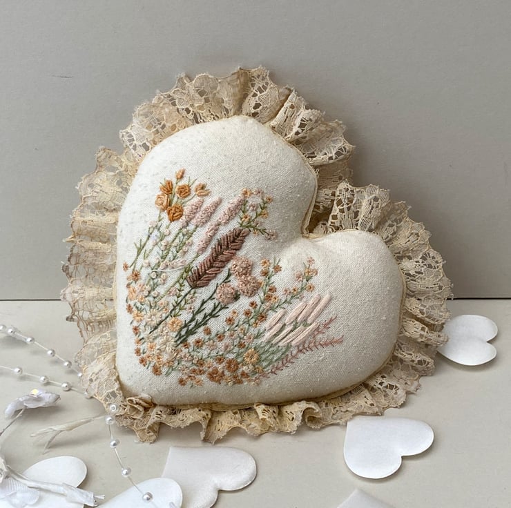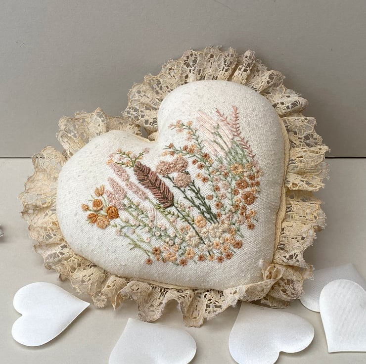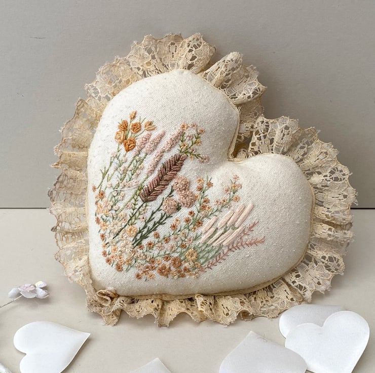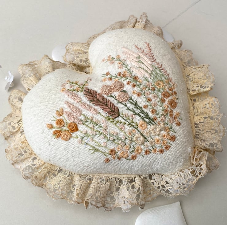 Finished with hand coloured lace, using watercolour paints I blended yellows, mustards, browns, white and greens until I was happy the colours matched those in the embroidery and applied to white lace which was left to dry then heat set with an iron. This was sewn into place around the edge of the heart, It gives a lovely soft, romantic vibe.
