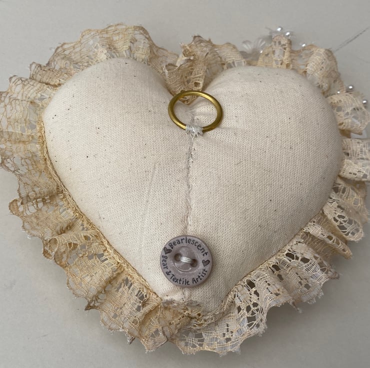 Beautiful hand embroidered ornamental heart which can be laid or hung on a wall. A highly detailed hand embellished stuffed heart measuring approx 5" width and length not including the lace designed and created by Bearlescent.