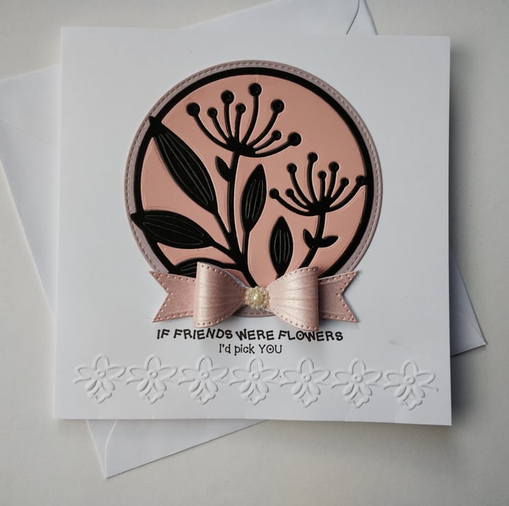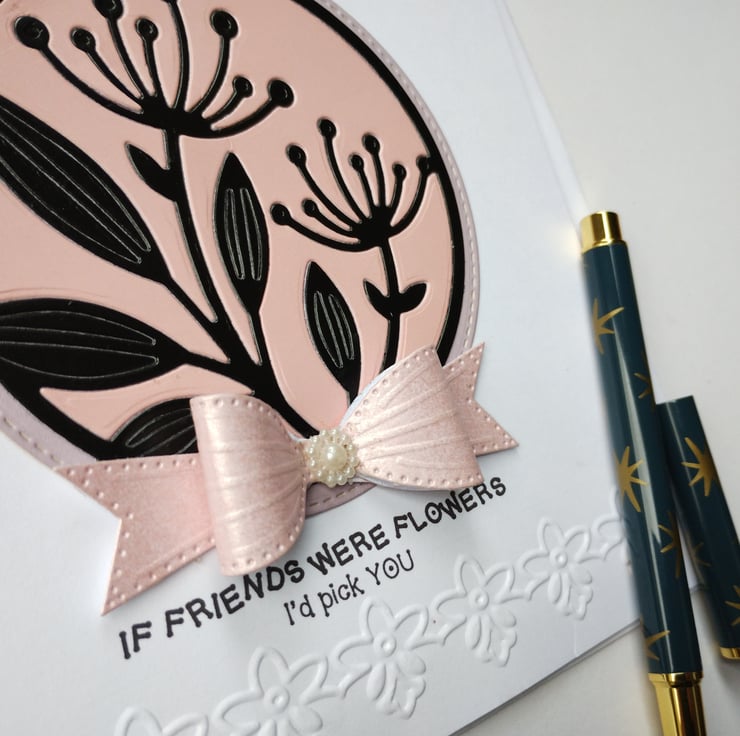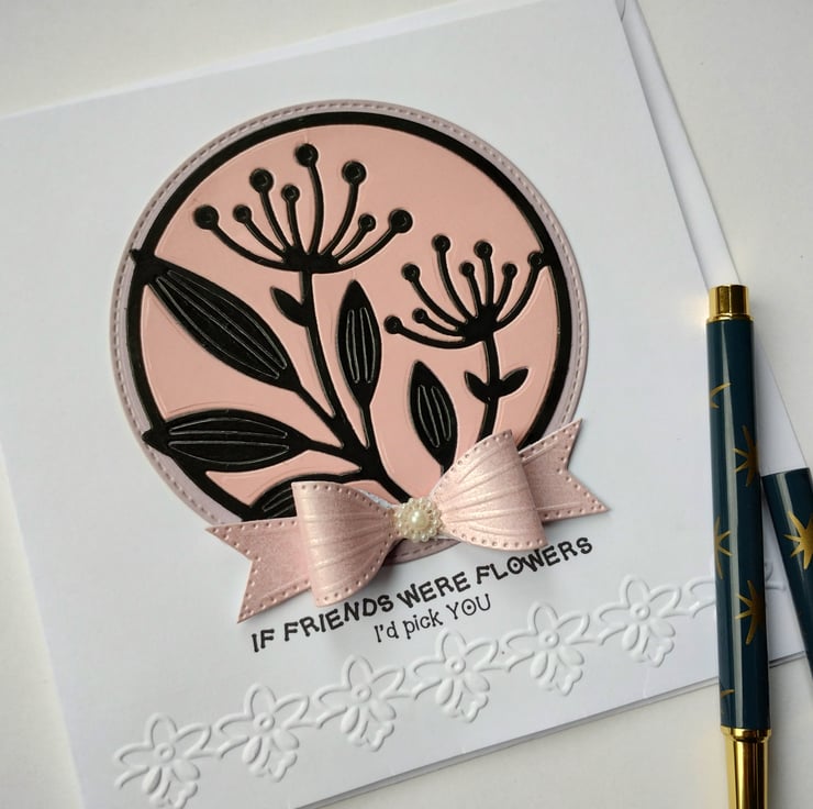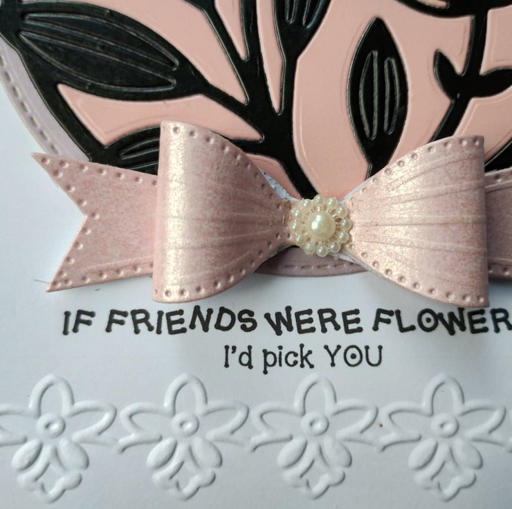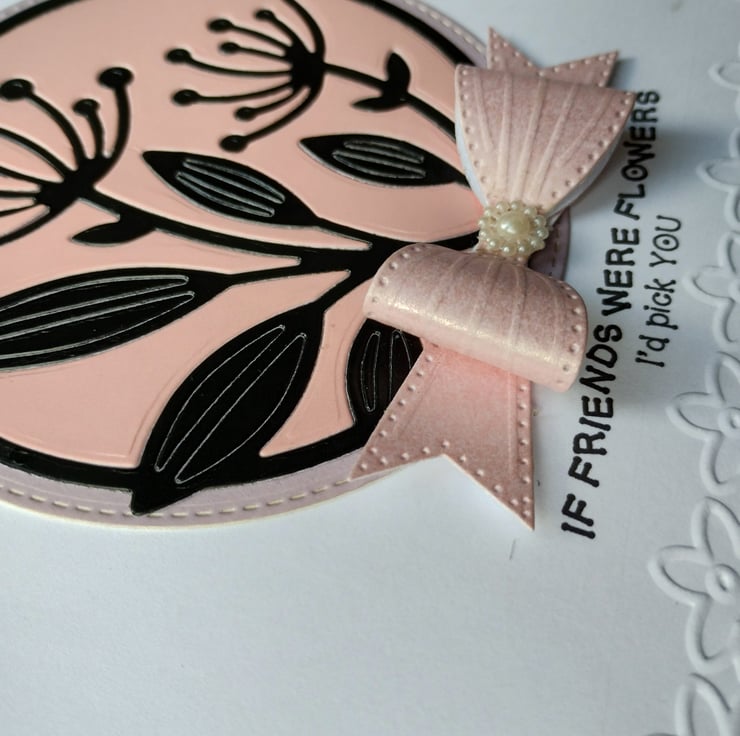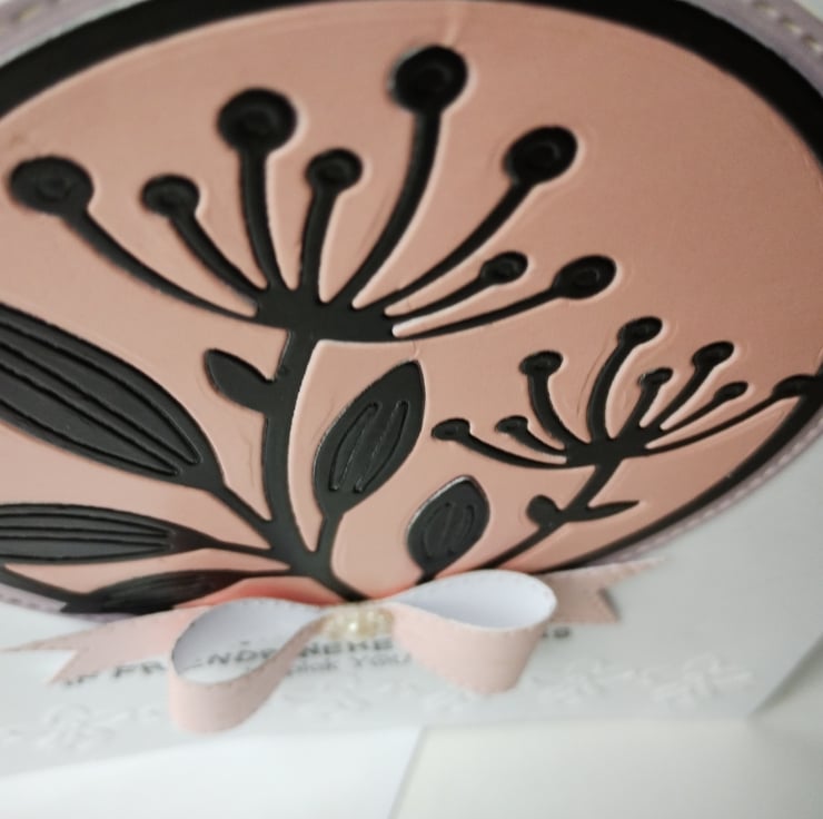 I've cut and paper-pieced the beautiful seedhead flowers from a combination of pink and black premium quality card and layered on top of a slightly larger stitched edge circle of lilac card. I've made a bow from gorgeous pearl finish pink cardstock and finished with a 'pearl' flower.