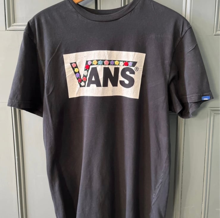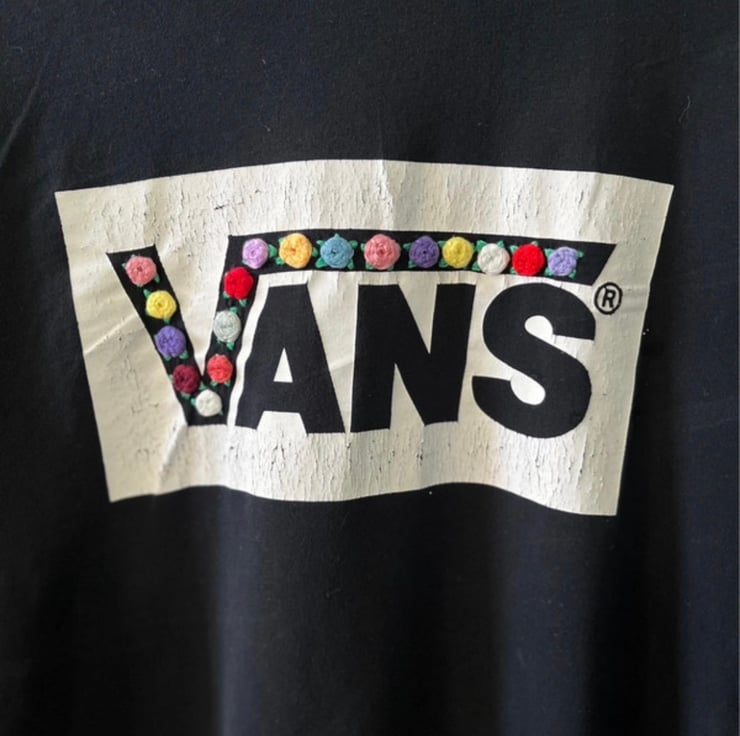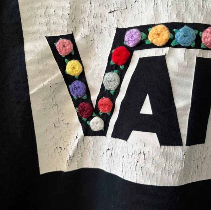 Add a touch of handmade charm to a classic favorite! This black Vans T-shirt has been lovingly transformed with original hand-sewn floral embroidery stitched inside the Vans logo, making it a truly one-of-a-kind piece. Each stitch is done by me, so no two shirts are ever the same.