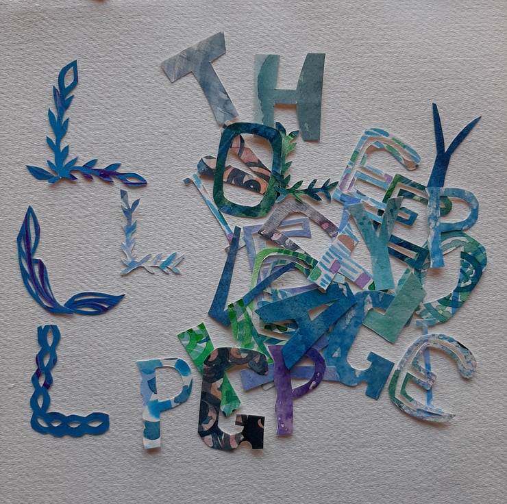 I've always been inspired by the old medieval illuminated manuscripts, particularly the borders. This is where the inspiration came from for this piece. The words are from my own poem and this uses all my favourite colours, jewel like blues, greens and purples. Each element of the original is cut out by hand, each letter, each flower and leaf, then laid onto a backing paper and glued in place. I used deli paper for the background colours which has a lovely translucence. They are coloured with ink pads.
