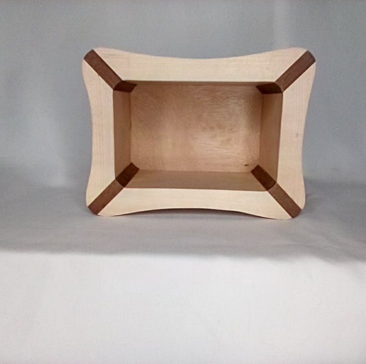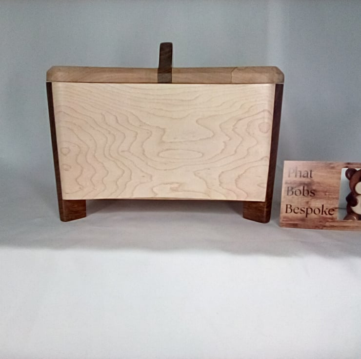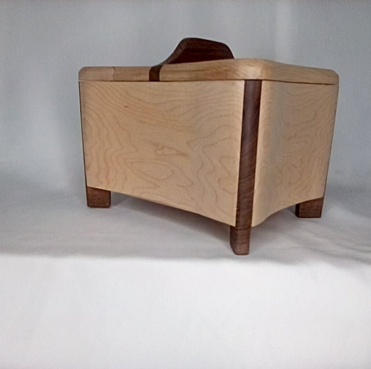 Curved maple and panga storage box hand made from phat bobs one of a kind collection every side of this box is curved in one or two directions making it very unique it's lift of lid with built in handle and panga corners and feet are giving this box a special appeal standing 19cm wide 15cm high and 14cm deep
