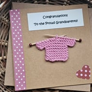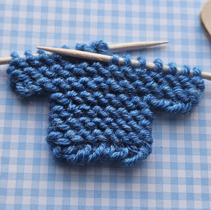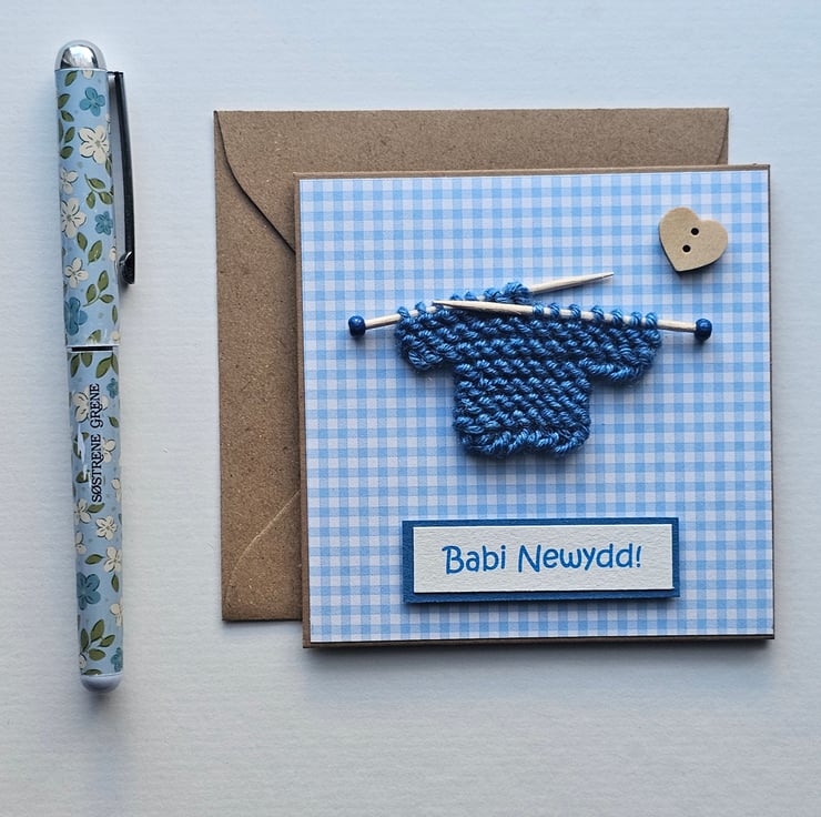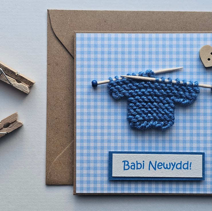 The little knitted jumper has been hand knitted by myself and transferred onto my handmade little knitting needles. The card is covered in gingham paper and finished with a wooden heart button. The text "Babi Newydd" is slightly raised.
