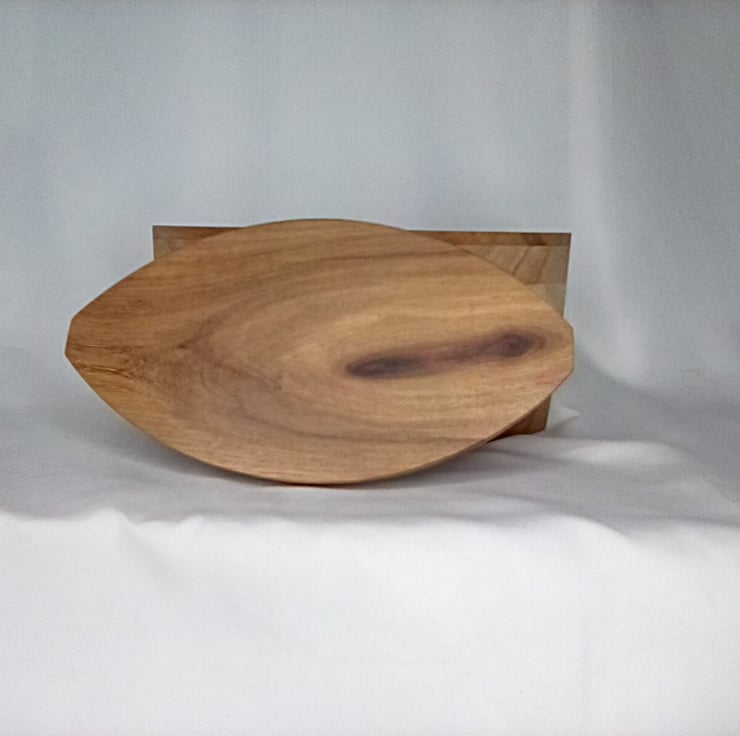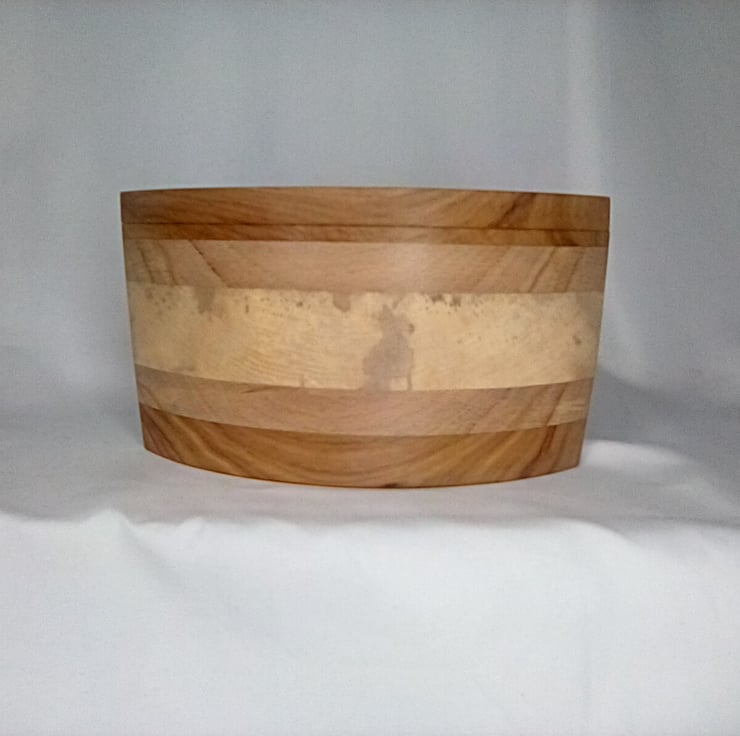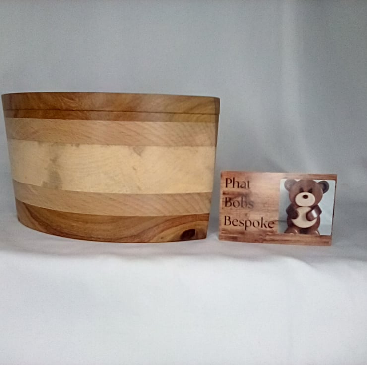 Beautiful hand crafted oval trinket box made from kyaat and English walnut with its oval shape and sloping sides it gives this box a unusual look with its lift of lid it really shows the beauty of the kyaat timber with its warm Orange glow standing 20cm wide 11cm high and 11cm deep
