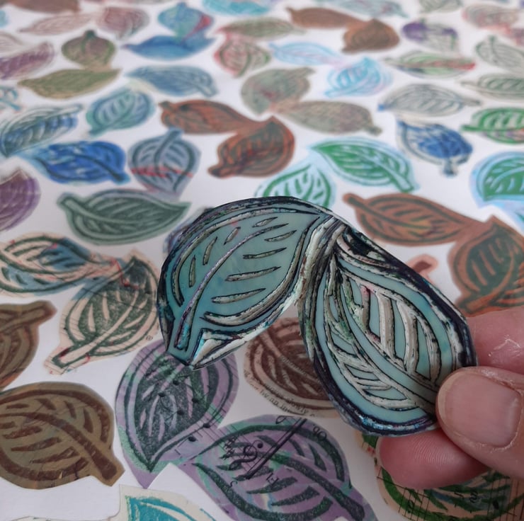 The images show the sample for sale, including size. The fifth one shows the linocut double leaf that was printed onto marbled papers to create this paper collage. The final image shows the work in progress with some of the leaves in place.
