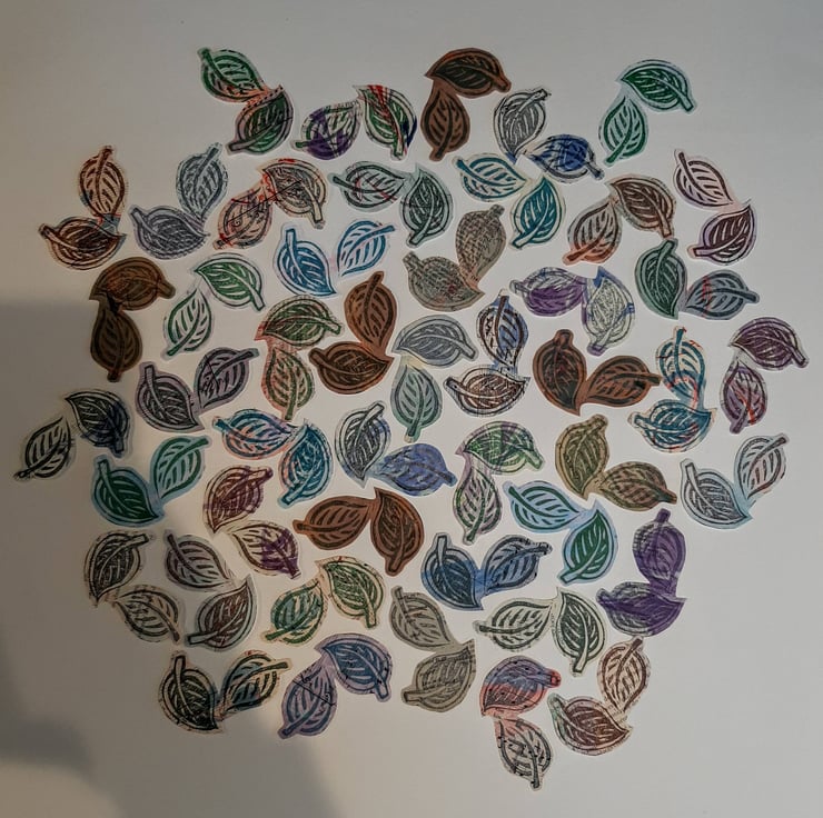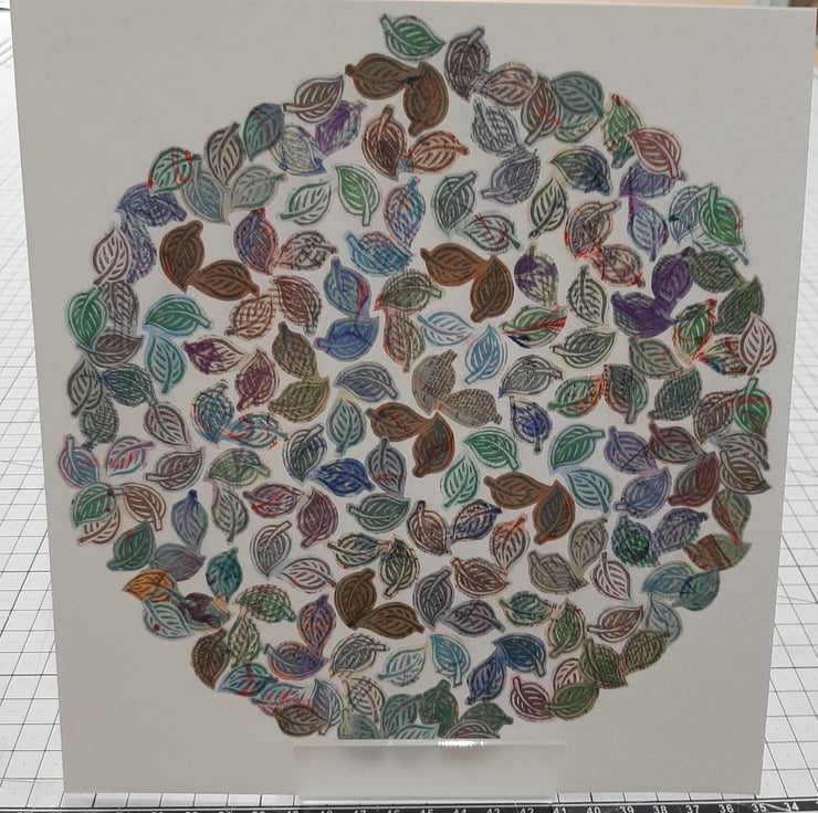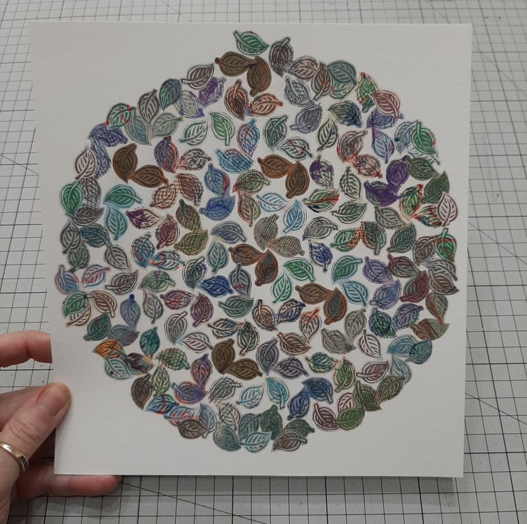 I had already cut the linocut of the two leaves together when I decided to create this large paper collage. Each double leaf is printed onto marbled papers, some of them bookpages with text for added texture. The each leaf or double is cut out individually and arranged onto a backing paper. I finally cut out the edge of the leaves to just keep the circle. It's a favourite image of mine and has been recreated onto a card and tea towel.