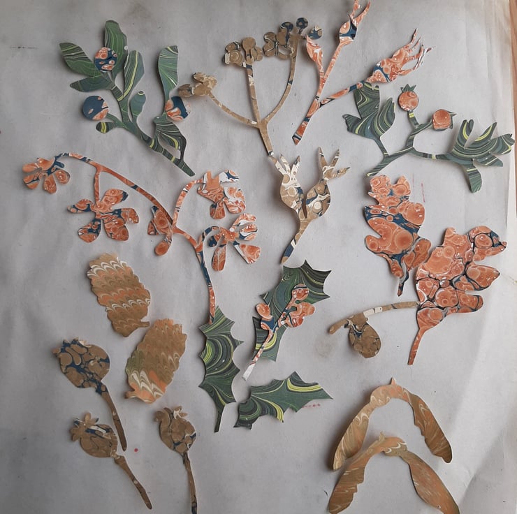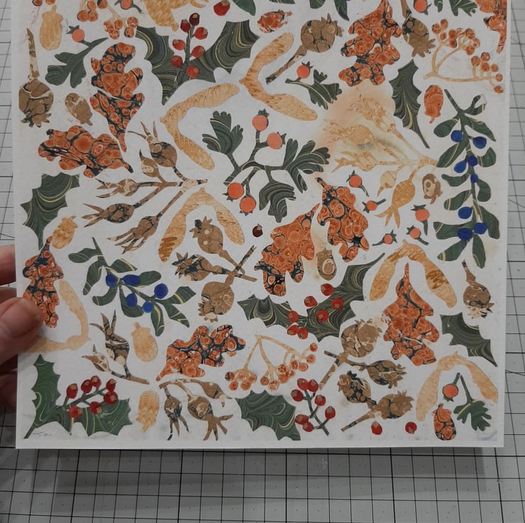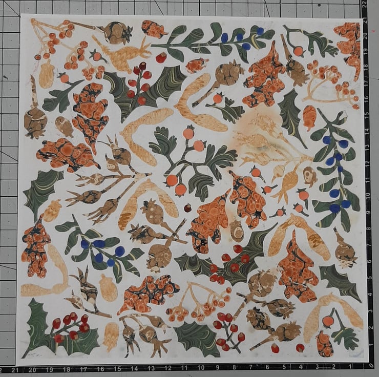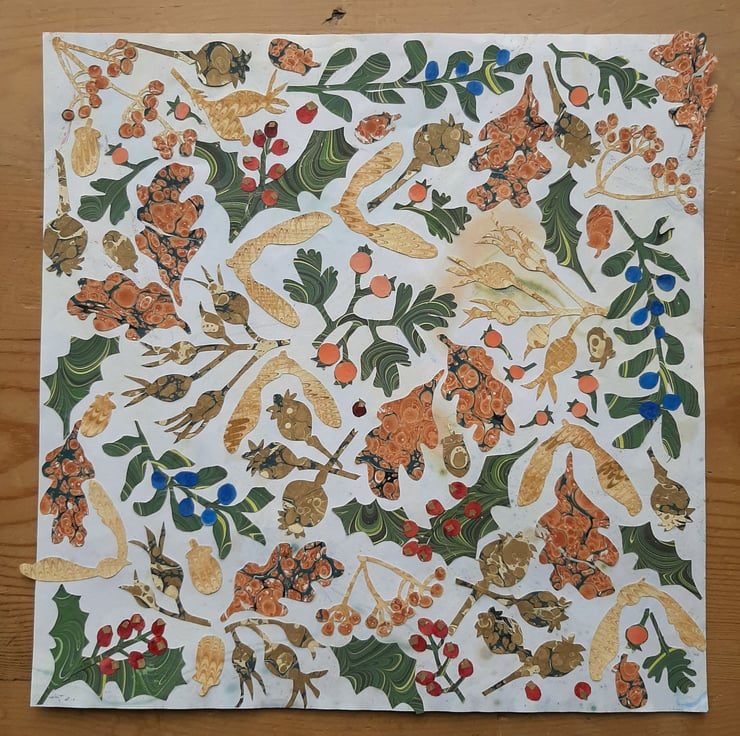 This paper collage is created from marbled papers with each leaf, seedhead and berry cut out individually.