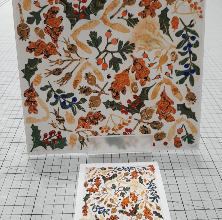 A few years ago I was given these beautiful marbled papers that my friend's partner had made. She found them on moving house after he passed away. I thought they were so beautiful I didn't want to use them at first, but then realised how silly that was! They are perfect for autumn leaves, seedheads and berries. Each element is cut out individually before being arranged onto the backing paper. I love this image and it is one of my most popular card designs. It also doubles as a Christmas card!