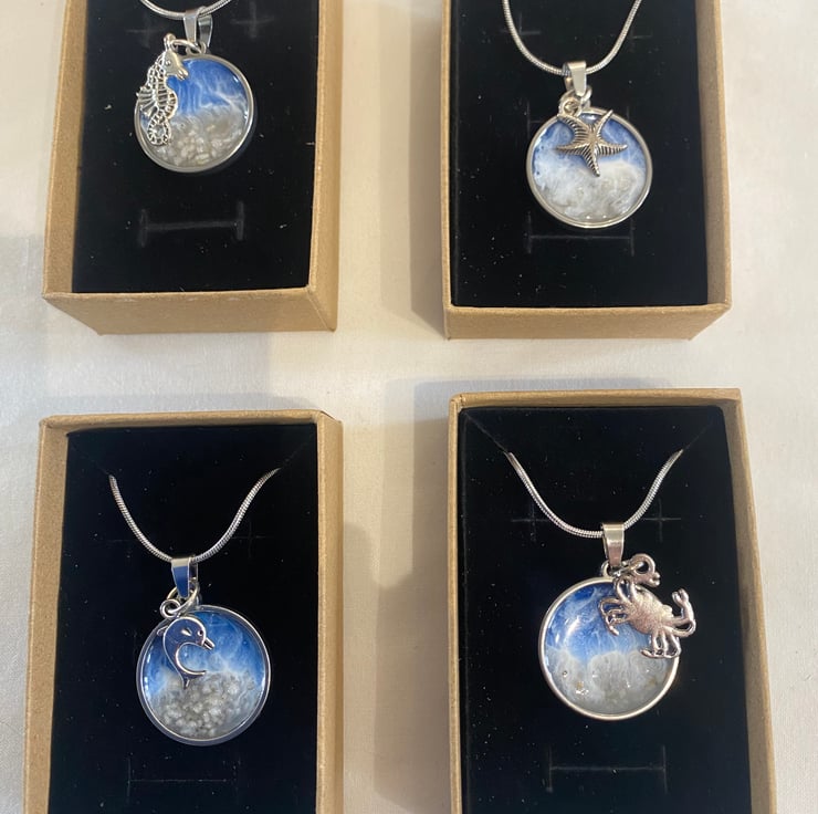 Made with stainless steel and filled with resin and sand, these pretty necklaces have a lovely elegant charm. Each necklace has been individually crafted and therefore each one is unique. Each necklace comes in a presentation box and is packed with care. Price is per necklace.