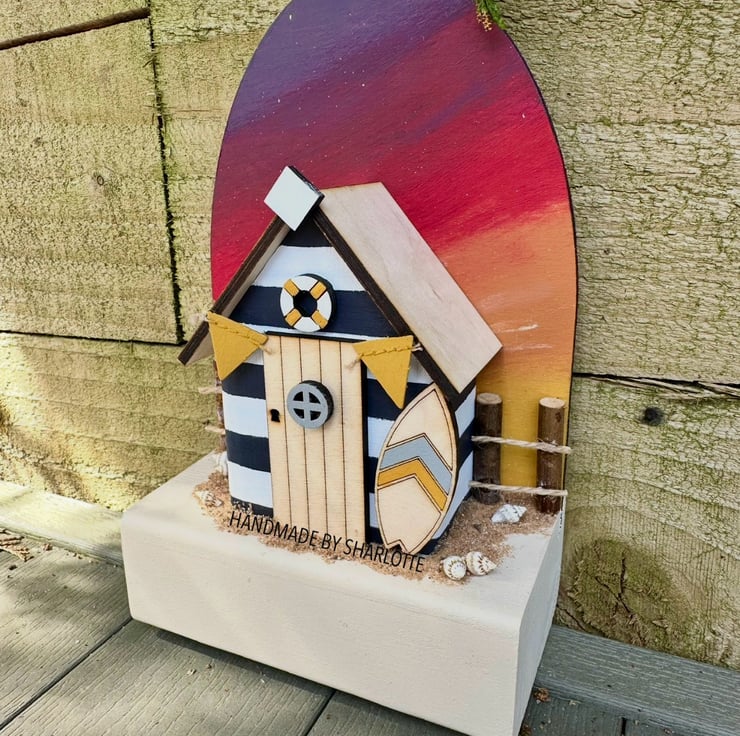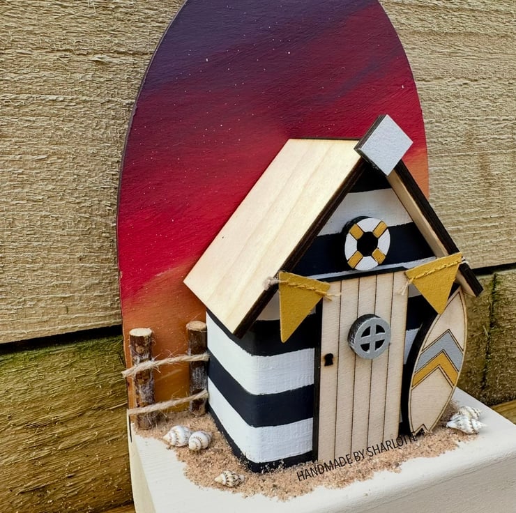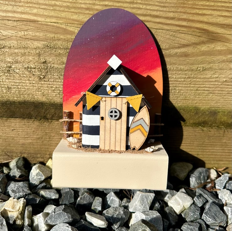 Limited Edition Hand cut, sanded, painted and assembled, on elements designed solely by myself, wooden single miniature Beach Hut Ornament with a sunset backdrop.