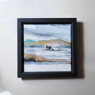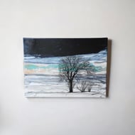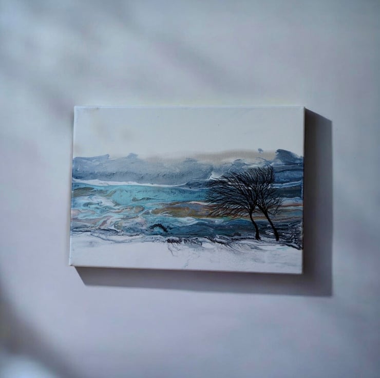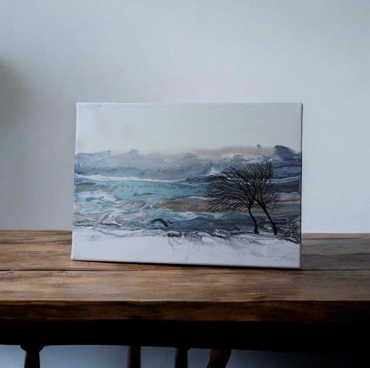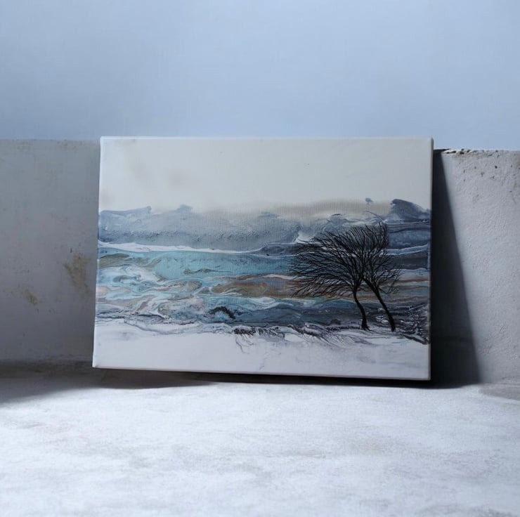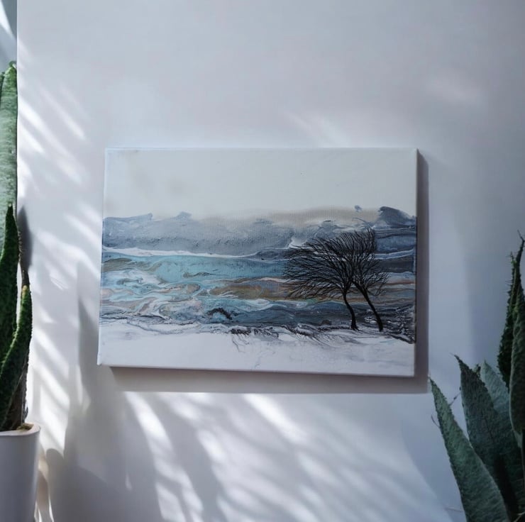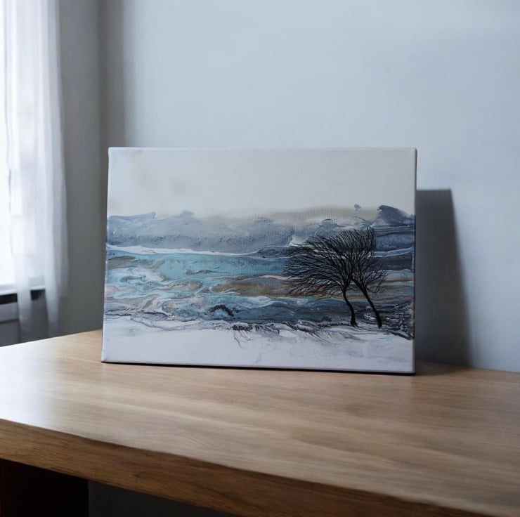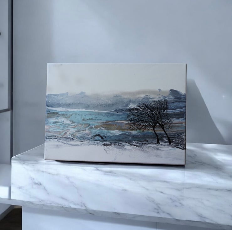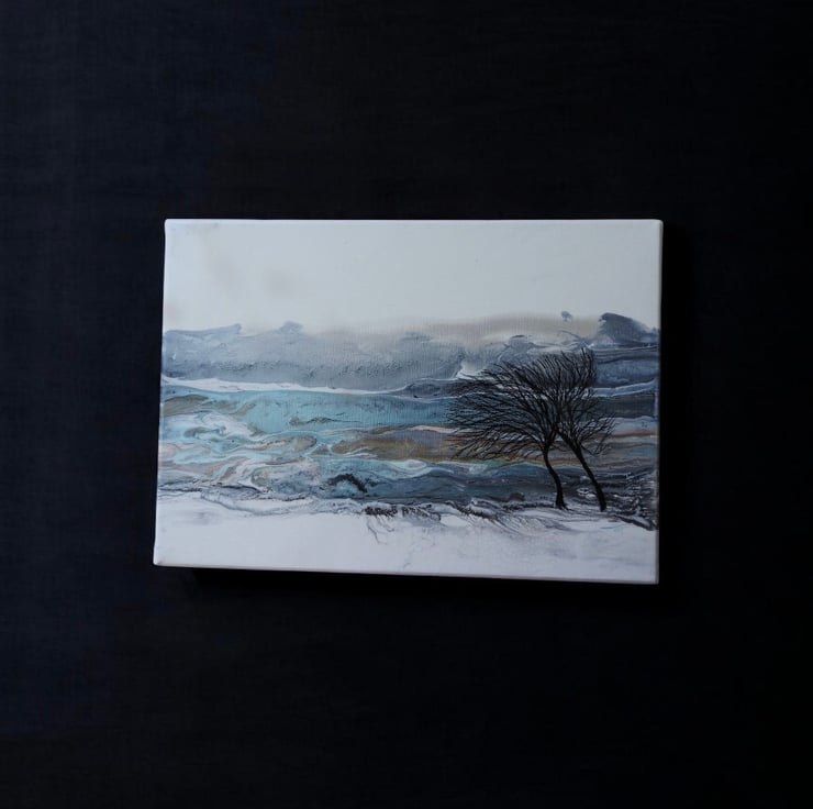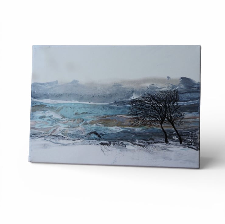 Two winter trees bending in the wind with stunning silvers , blues , turquoise and greys this painting shines.