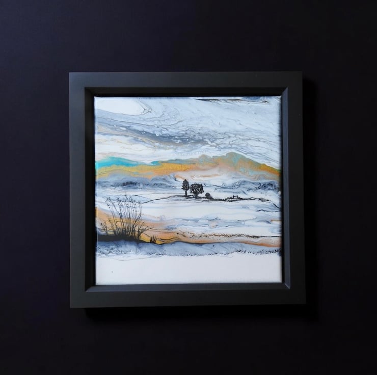 Depicting Northumberland hills original painting , a snowy scene shimmering golds and silvers and turquoise with a turbulent sky .