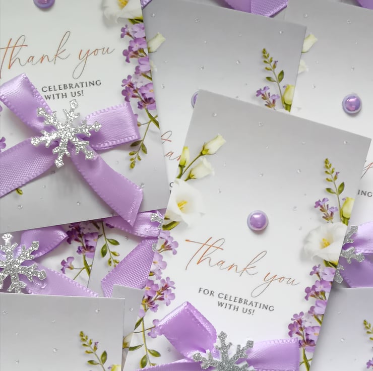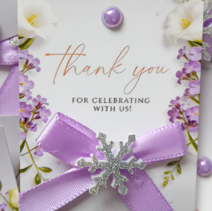 Enhanced with a lilac bows. Each card is supplied with a cellophane sleeve.