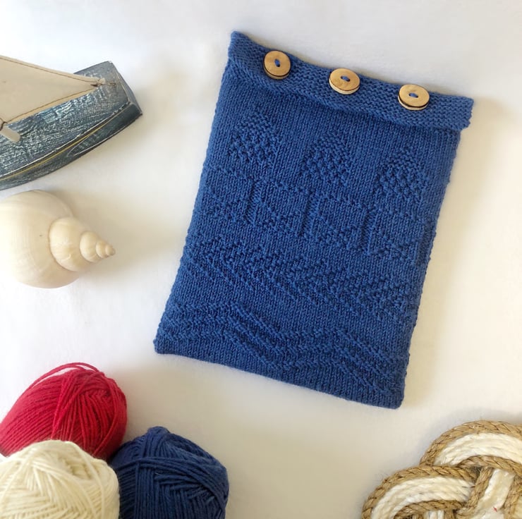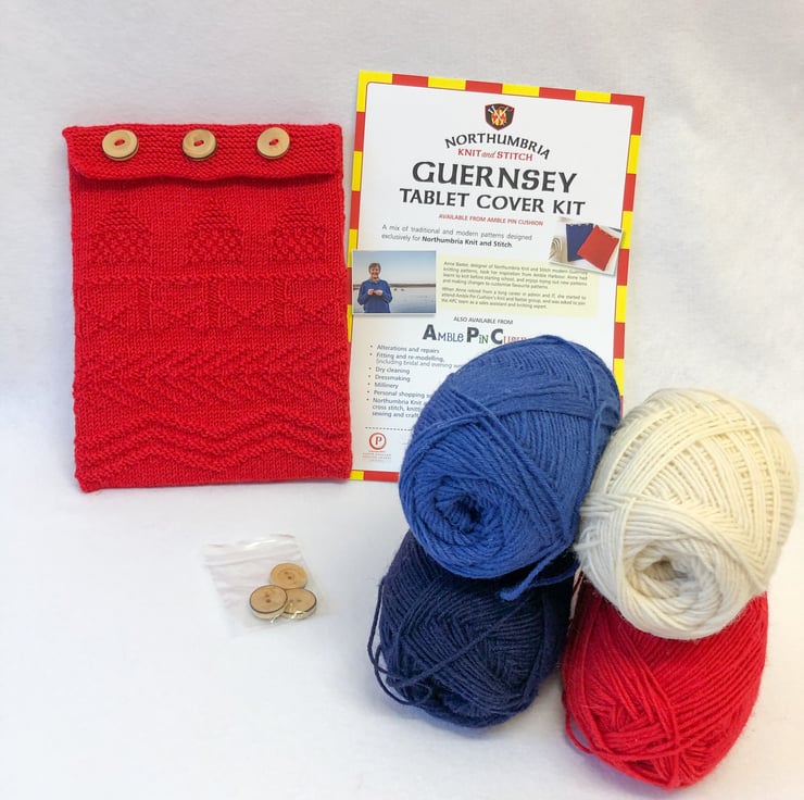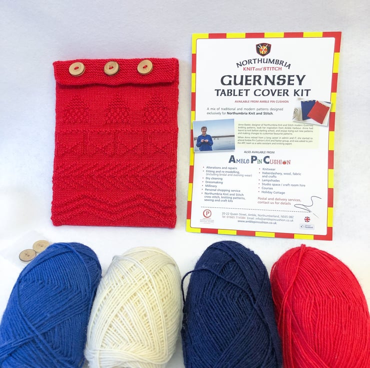 Our exclusive Guernsey Tablet Cover Kit, knitted in a mix of traditional and modern Guernsey patterns as a rectangle, is an introductory product for those who are new to this style of knitting, or who are interested in heritage knits. The tablet cover uses 5-ply Guernsey 100% British wool available in natural, navy, red or Helford blue. Please state your colour choice when booking. Kit cost includes pattern, yarn and wooden buttons.