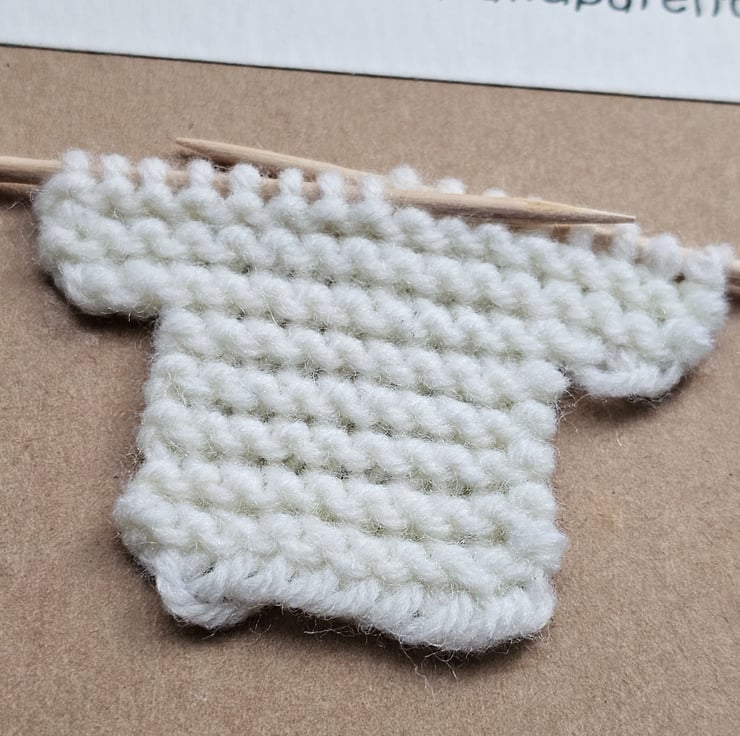 The knitted jumper is knitted by me with quality cream yarn and then transferred onto my handmade tiny knitting needles. The text on inkjet watercolour paper. The card is finished with a matching length of cream spotty ribbon and a paper heart shape. You can also purchase small knitted jumpers gift tags in a variety of colours in my shop.