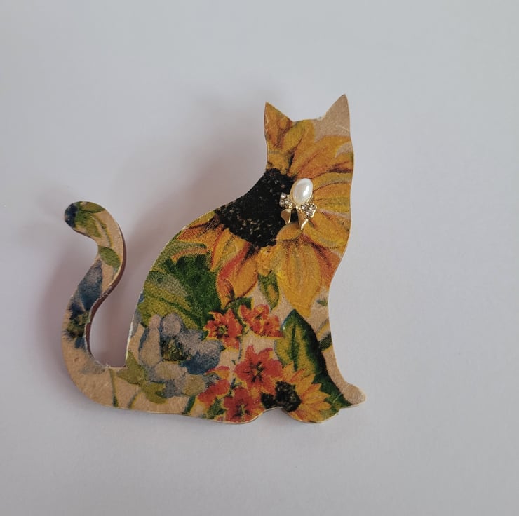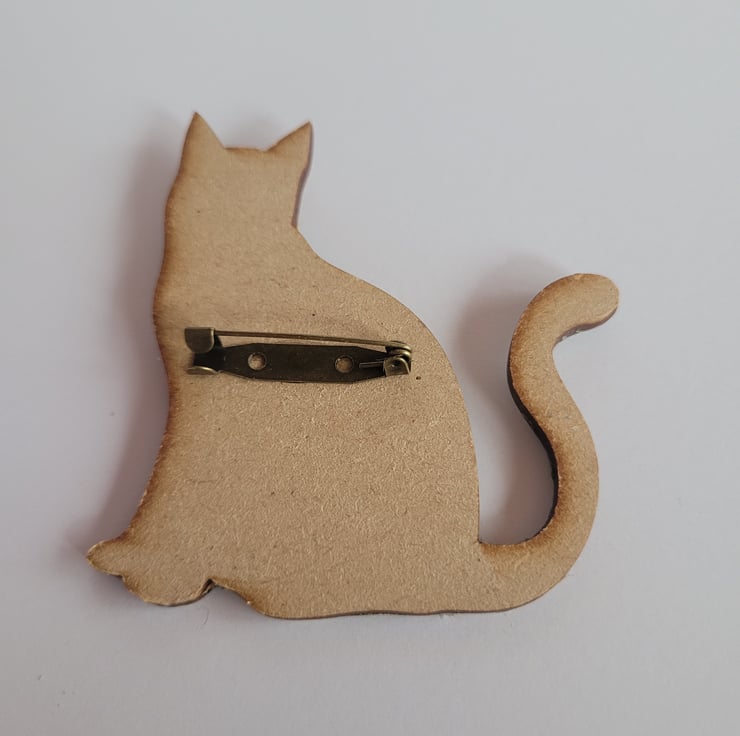 Decoupage Wooden Cat Brooch.
