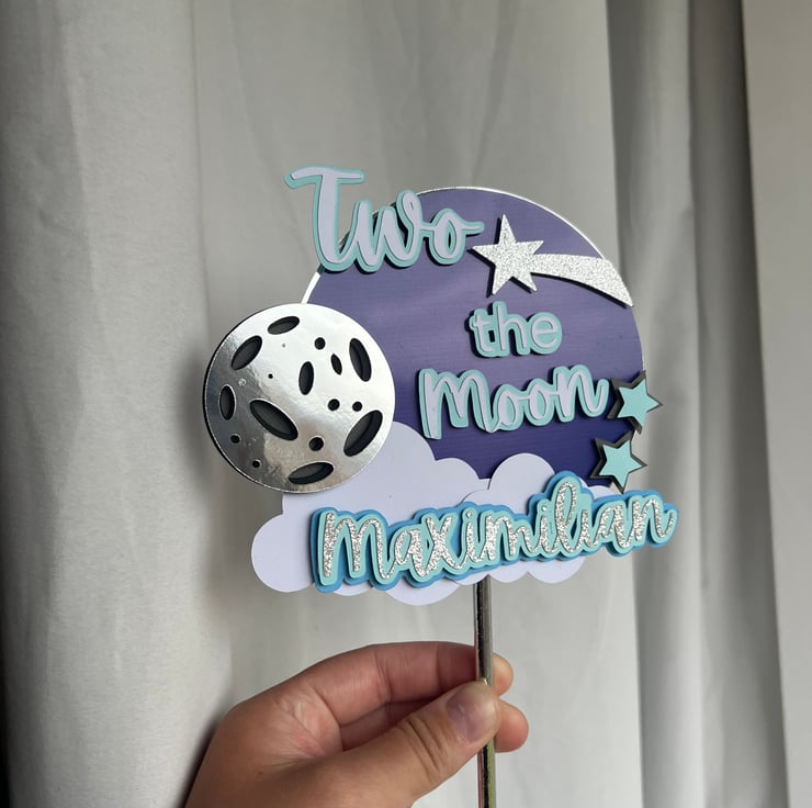 Celebrate your little star with this adorable “Two The Moon” cake topper!